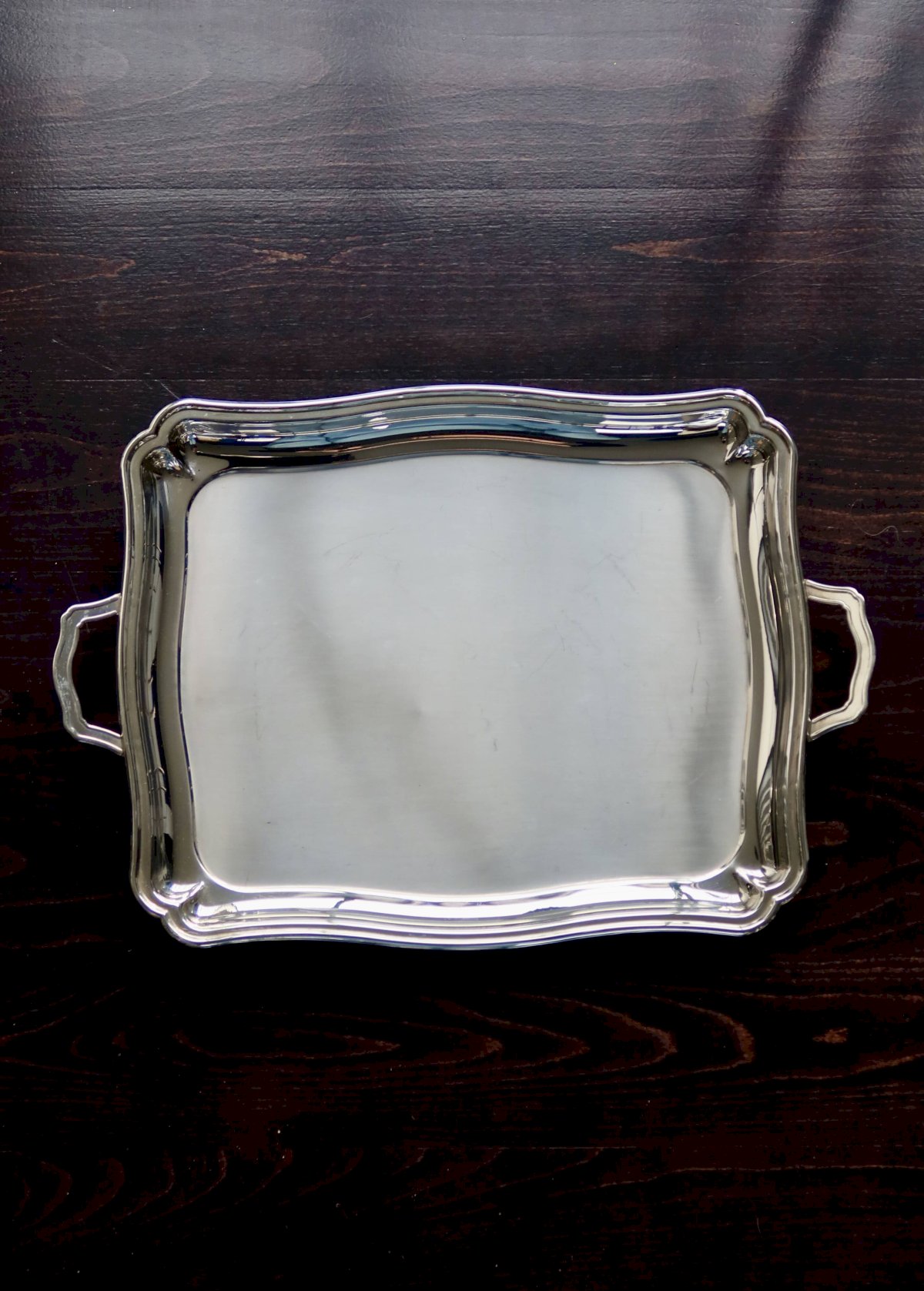Belle brillance générale, fines marques d’usage au centre (micro-rayures de service) sans bosse ni jeu des poignées—parfait pour dresser cafés, thés ou un plateau apéritif.Dimensions: 53cm X 37cm.