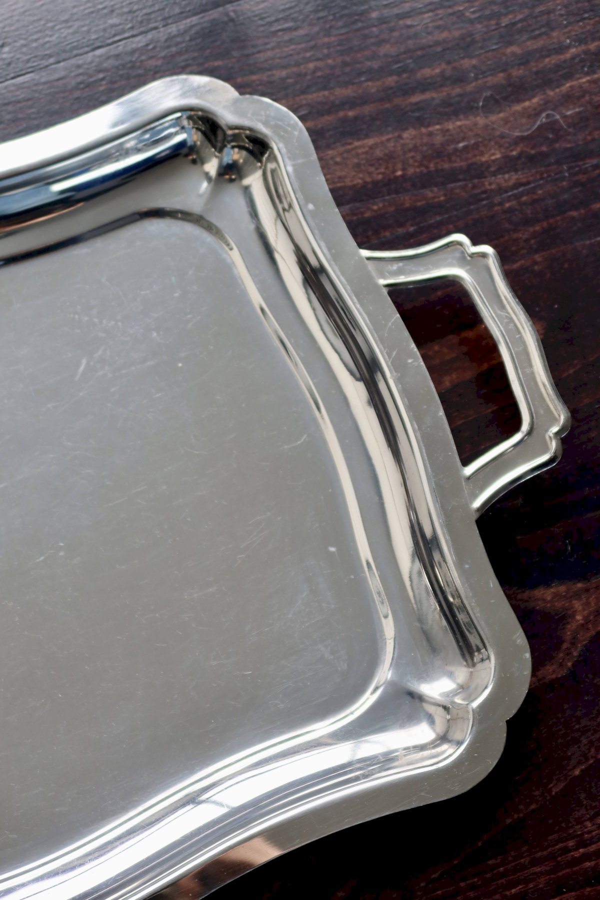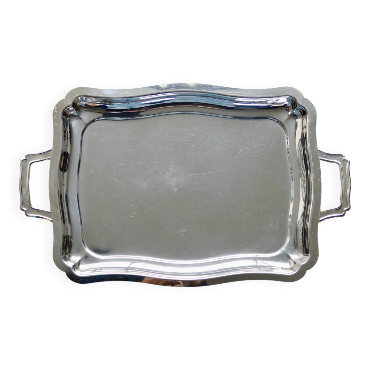 Grand plateau de service en métal argenté, au contour chantourné et aux deux poignées latérales moulurées.