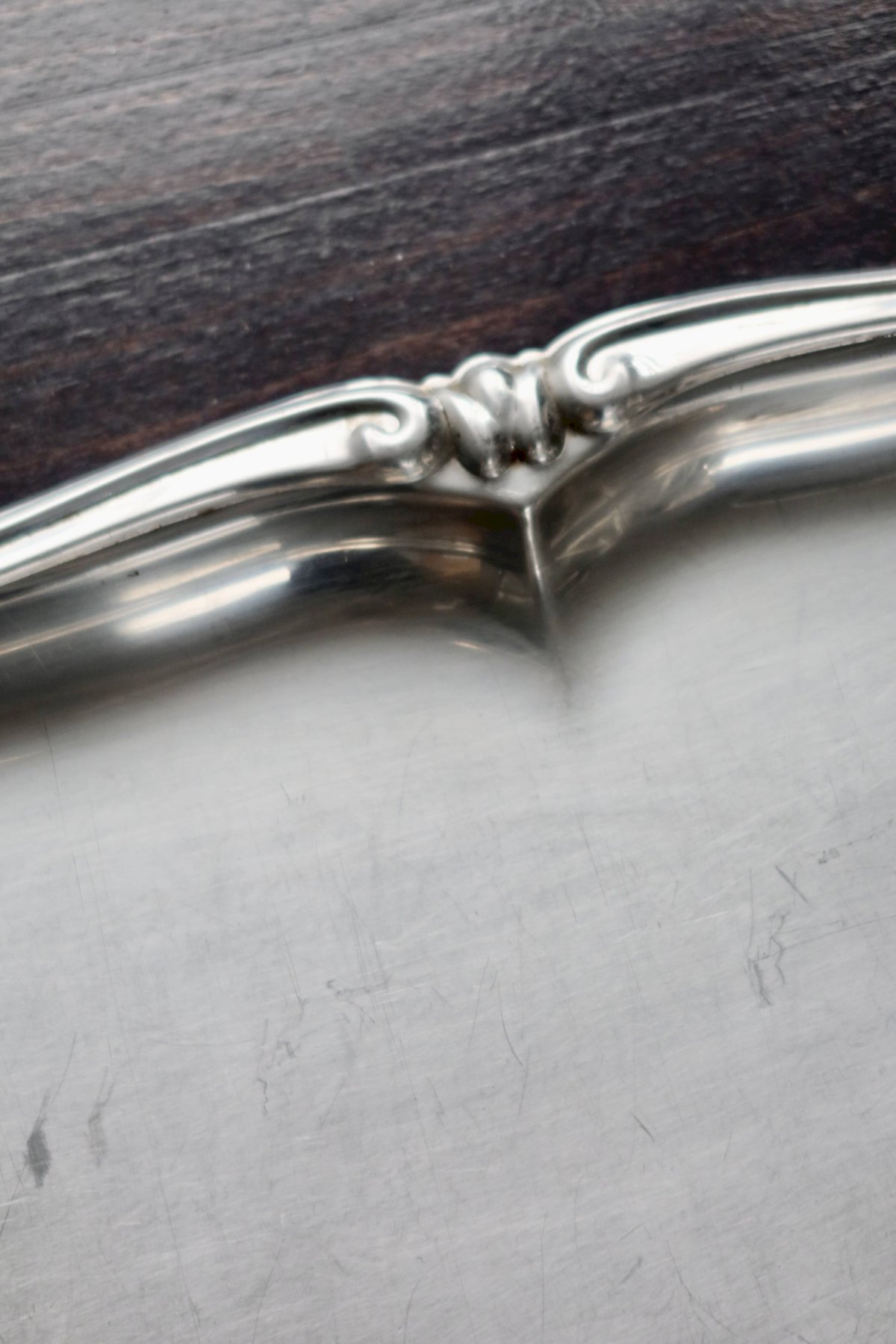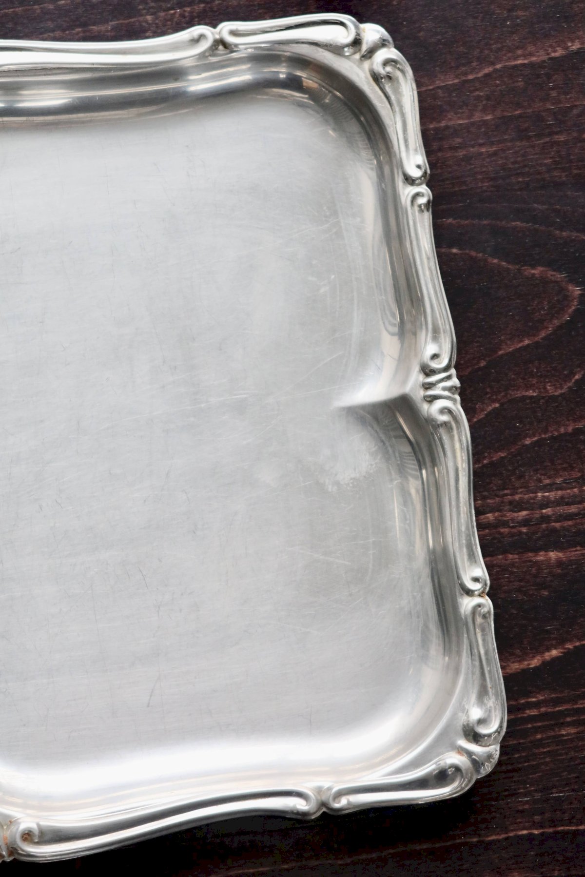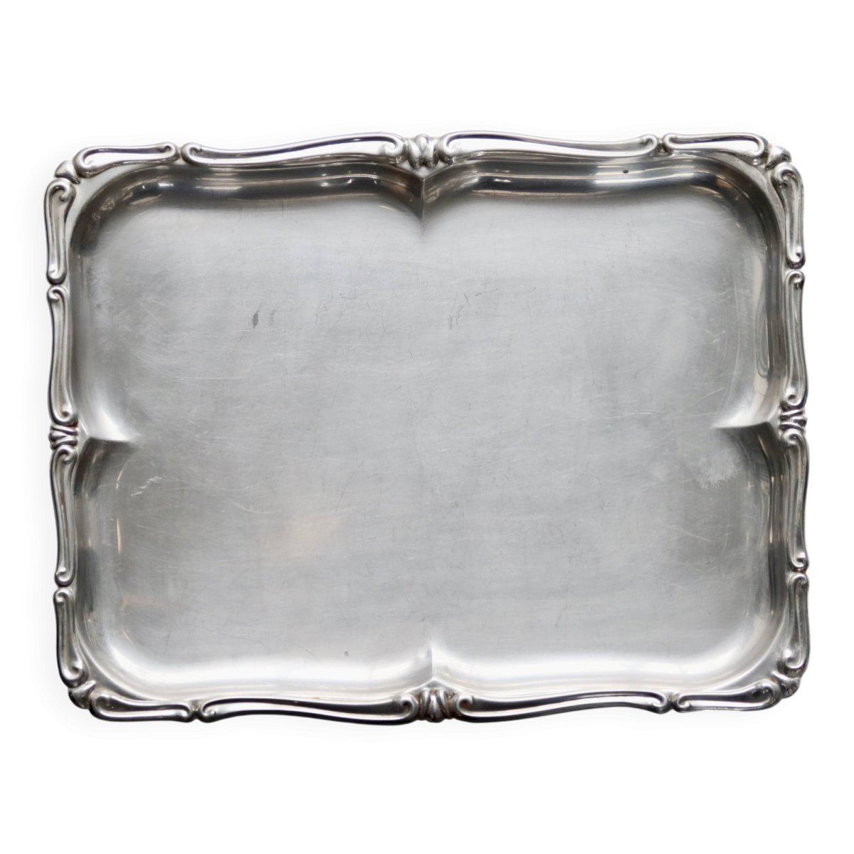 Plateau rectangulaire en métal argenté au bord rocaille finement travaillé, dans un style classique et élégant.