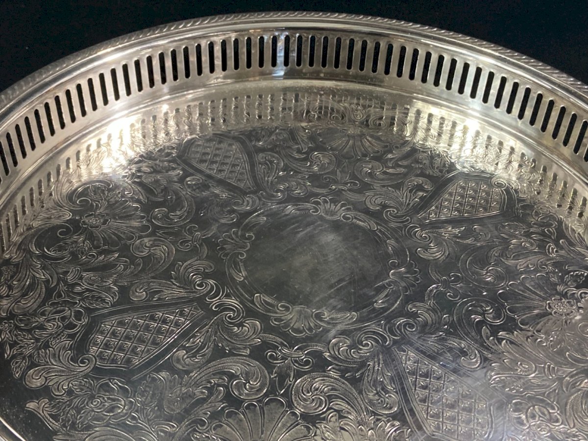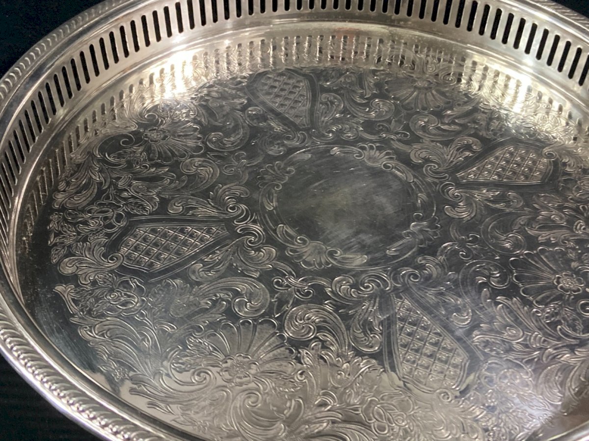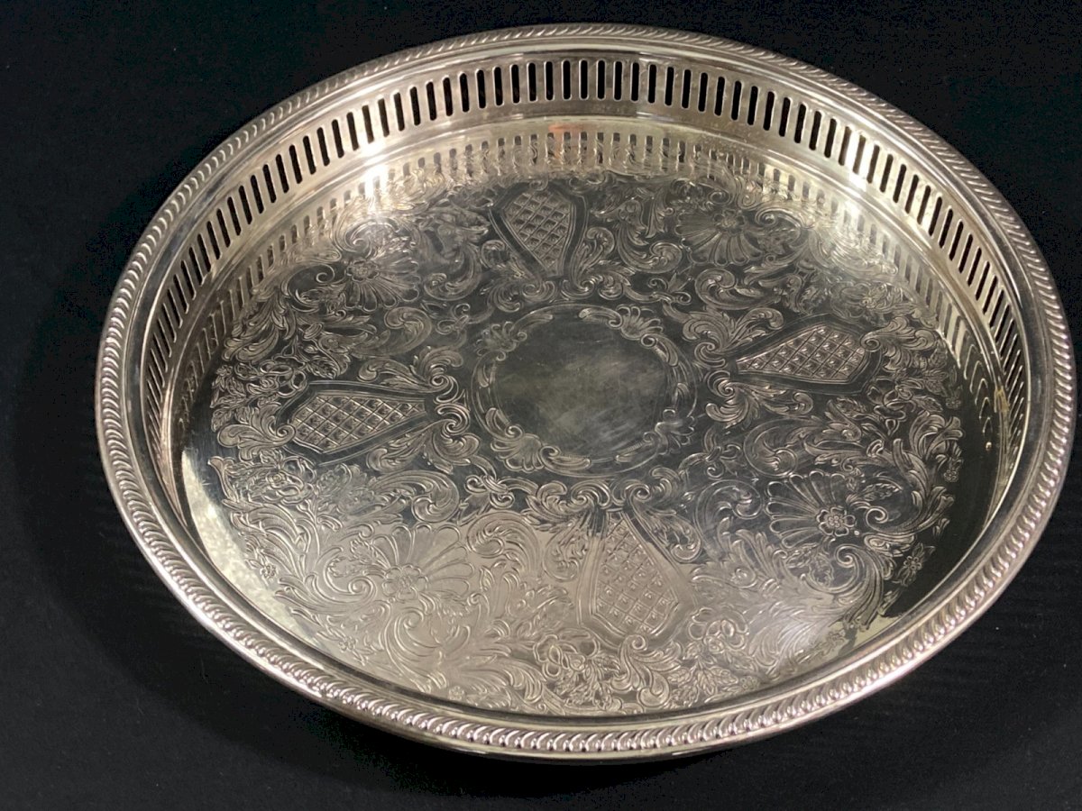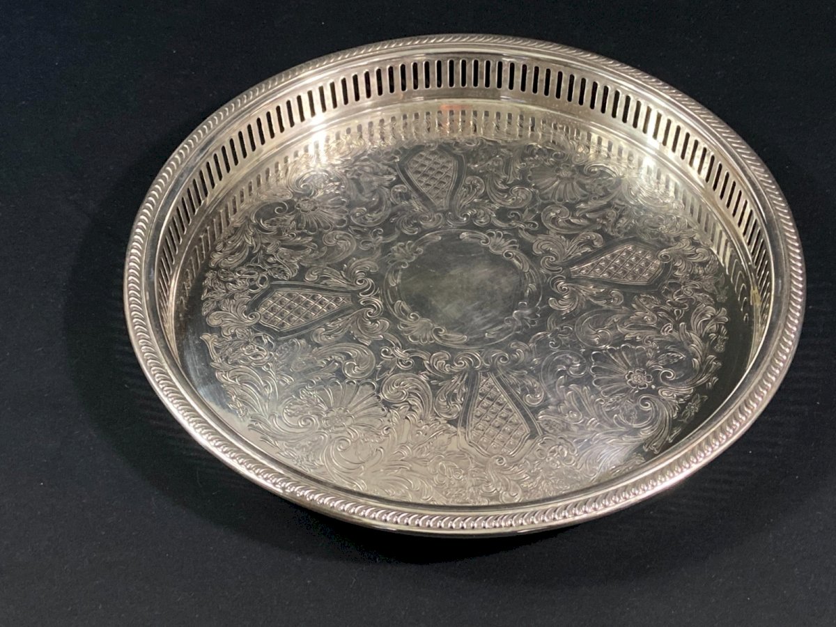 Plateau rond en métal argenté de style Régence à bordure ajourée