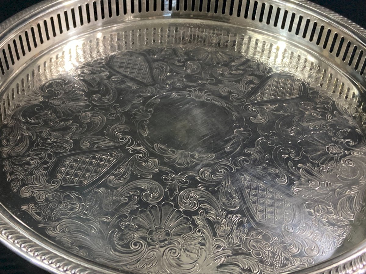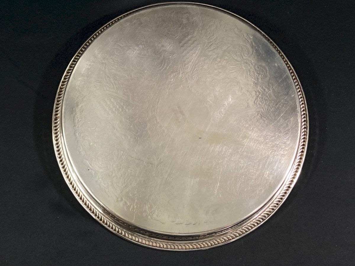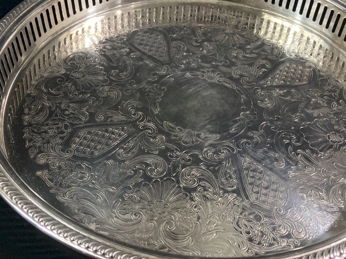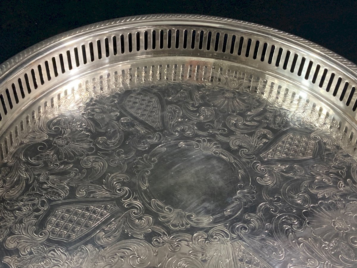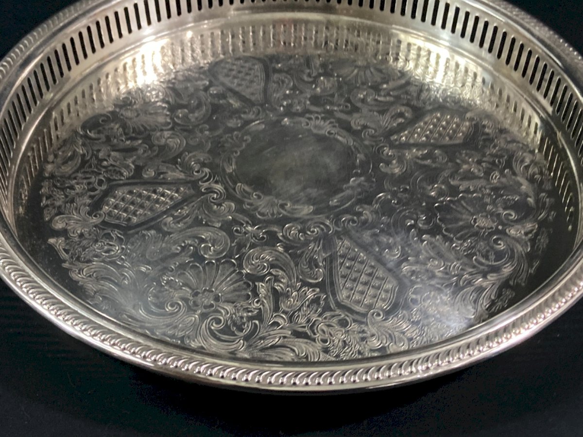 Plateau rond en métal argenté de style Régence à bordure ajourée