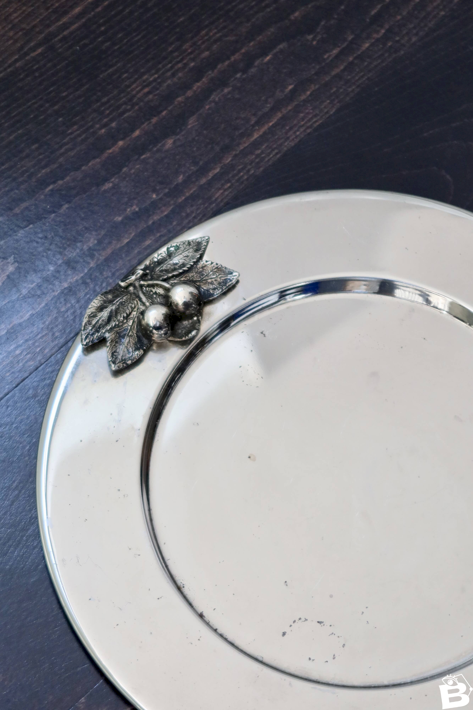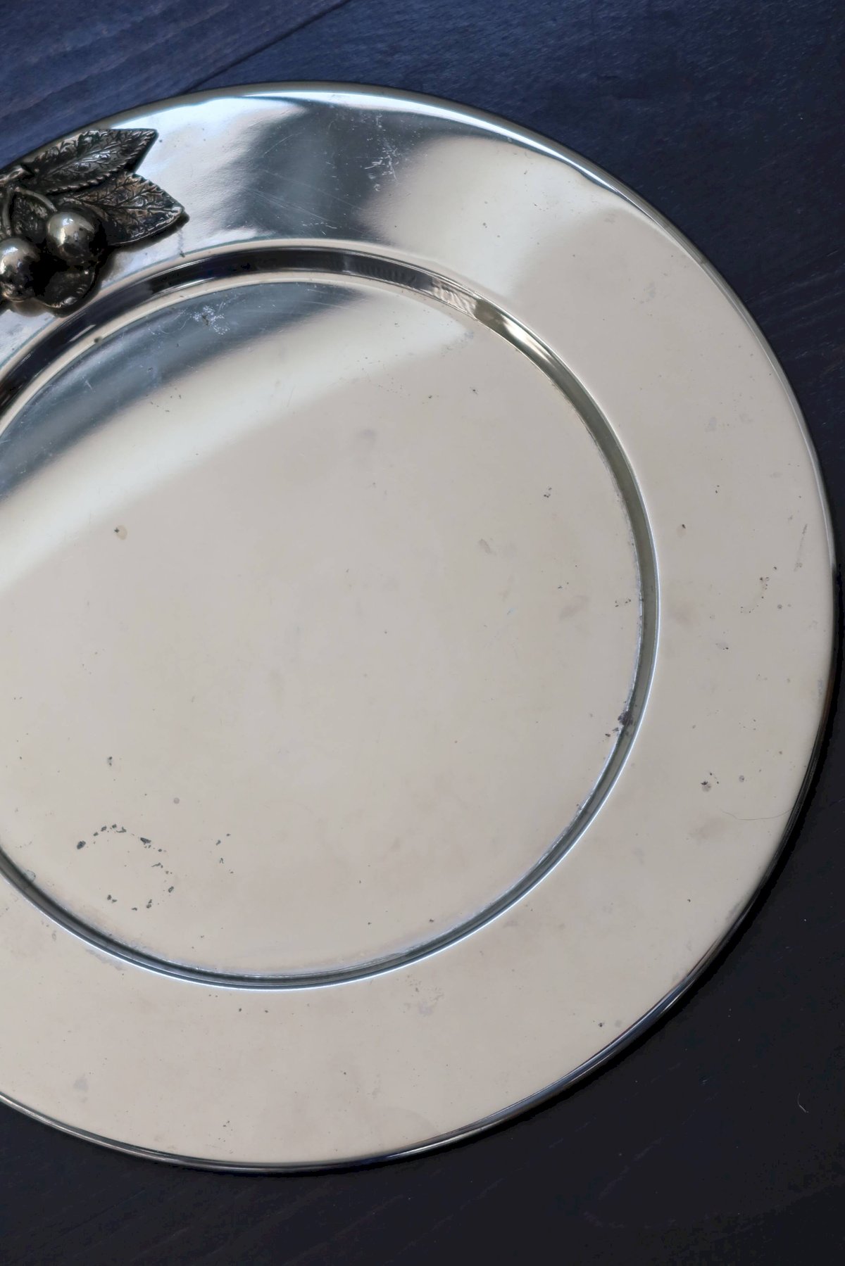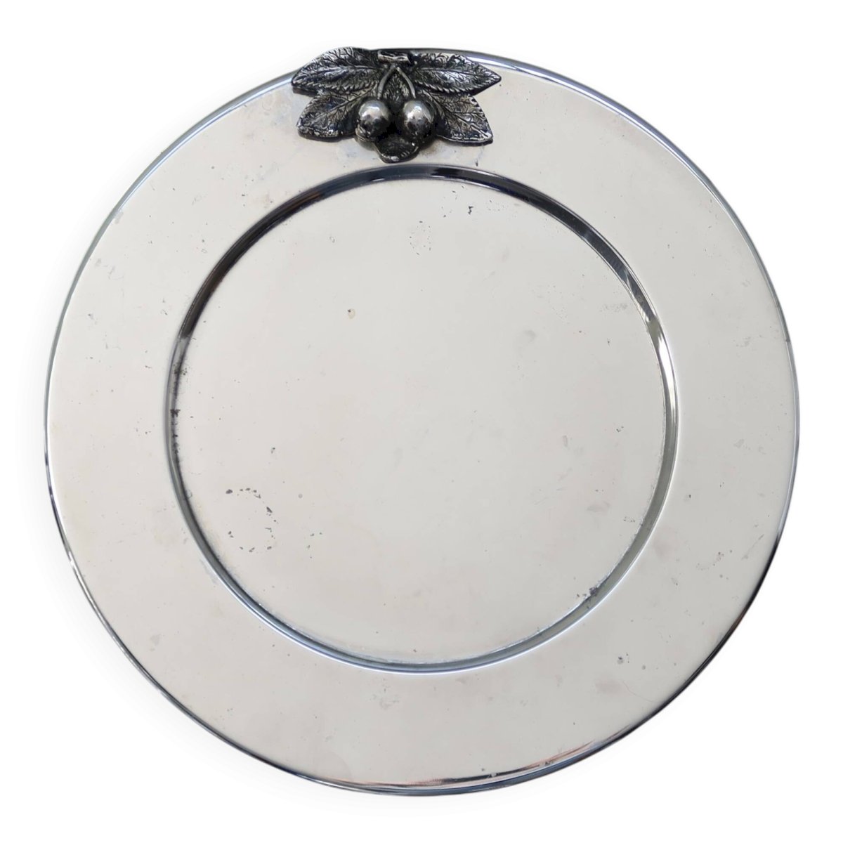 Élégant plateau rond en métal argenté, rehaussé d’un beau motif cerises en relief.