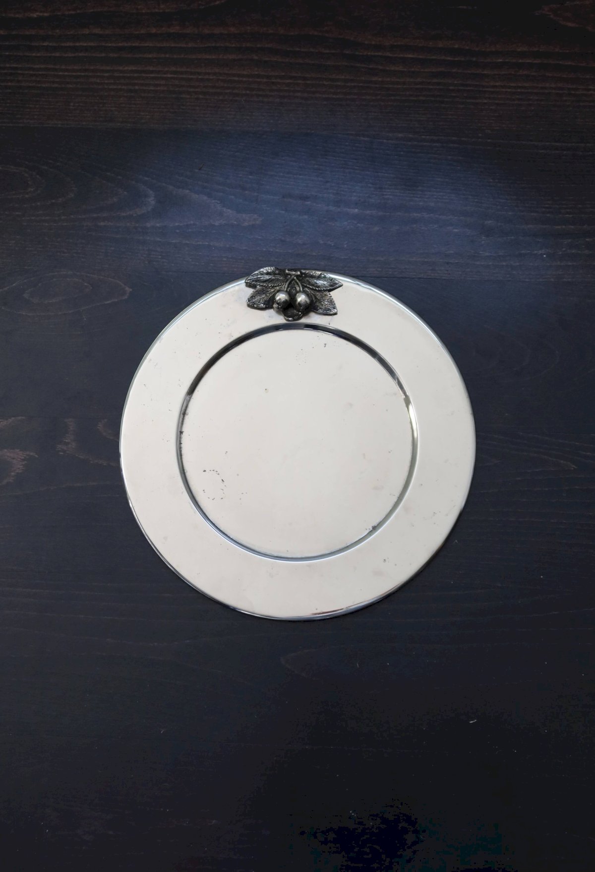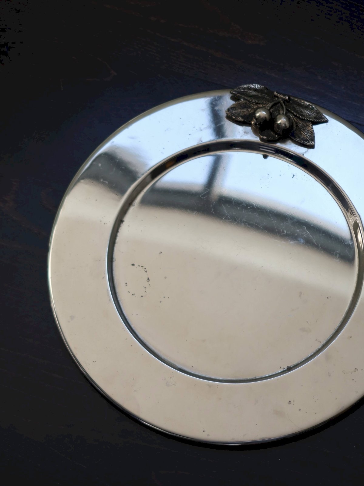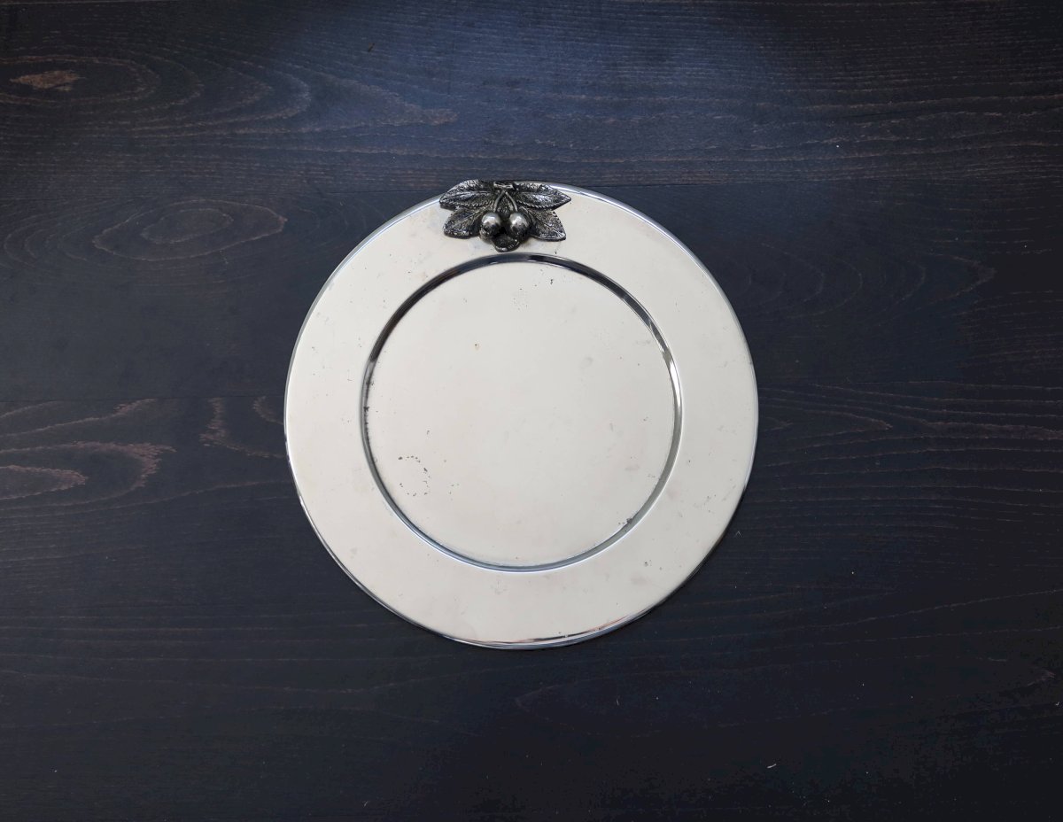 Élégant plateau rond en métal argenté, rehaussé d’un beau motif cerises en relief.