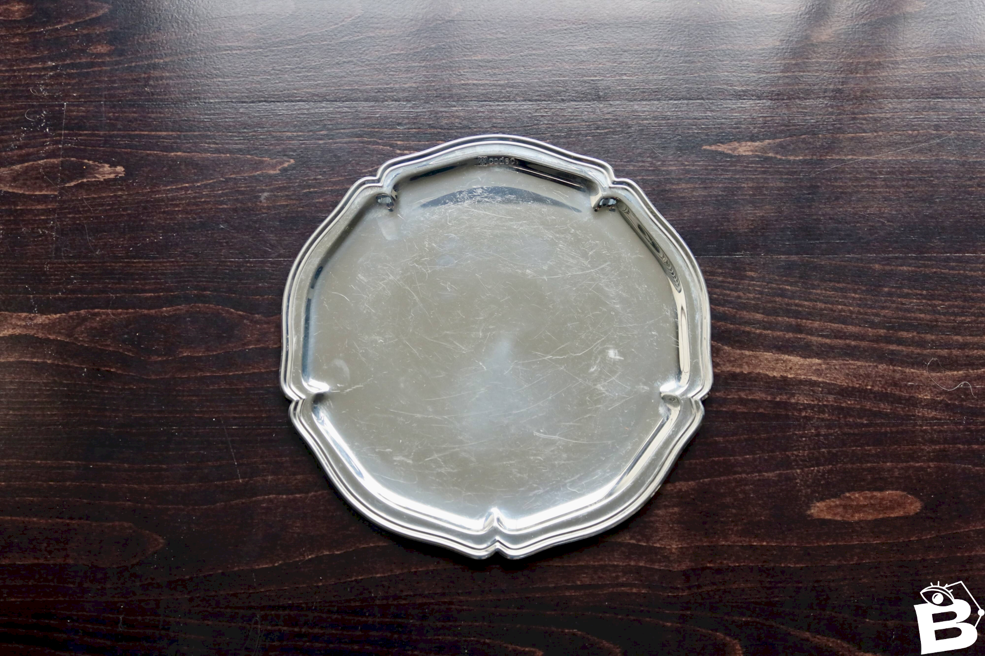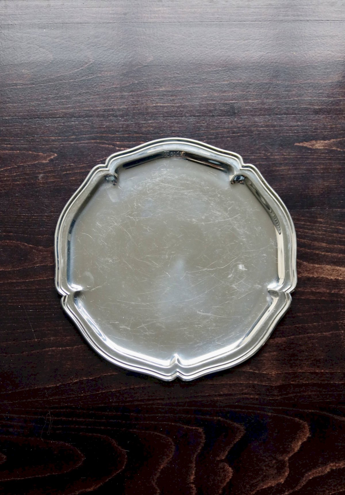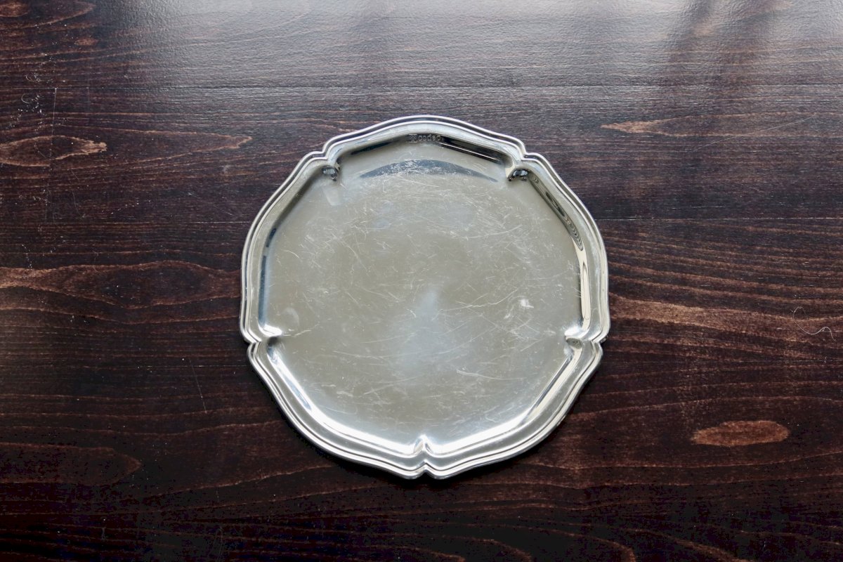Petit plateau gravé vintage en métal argenté brillant
