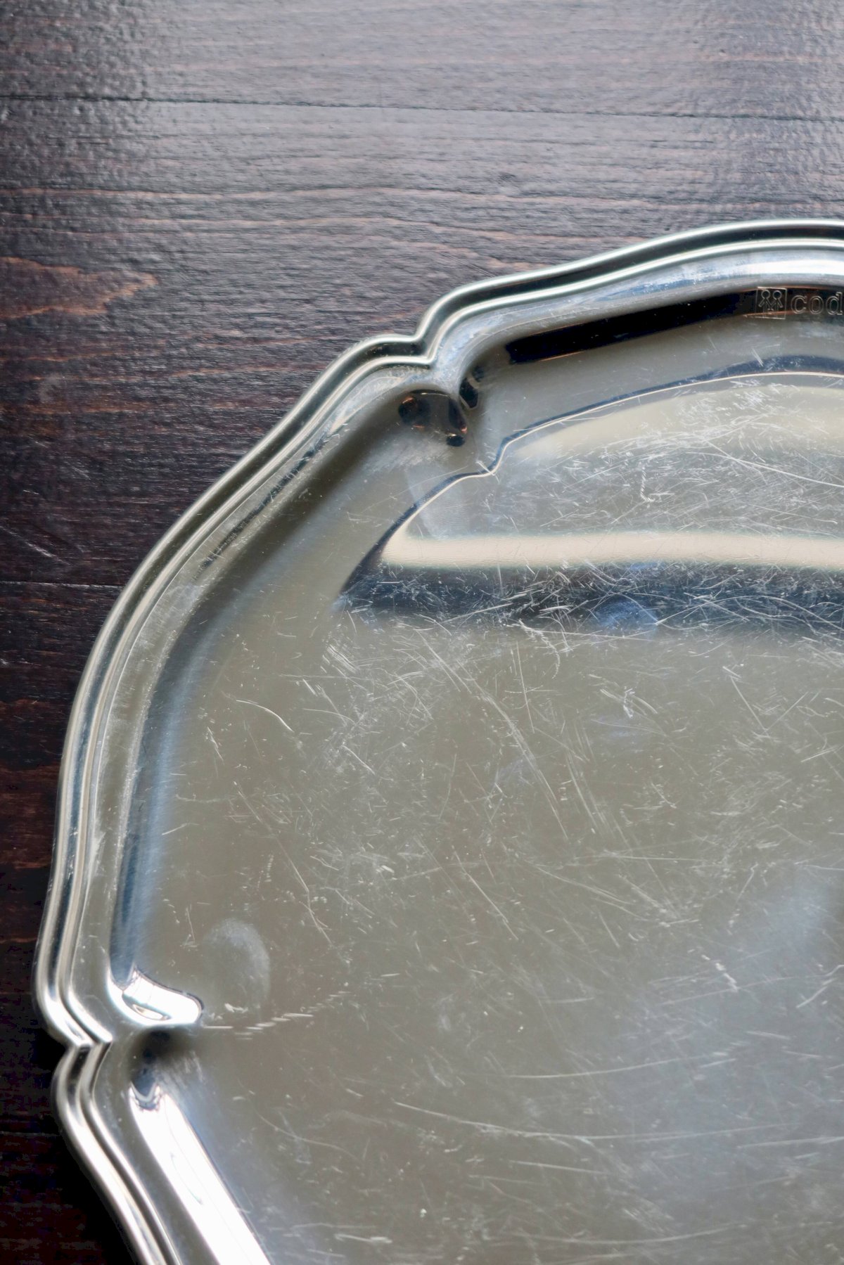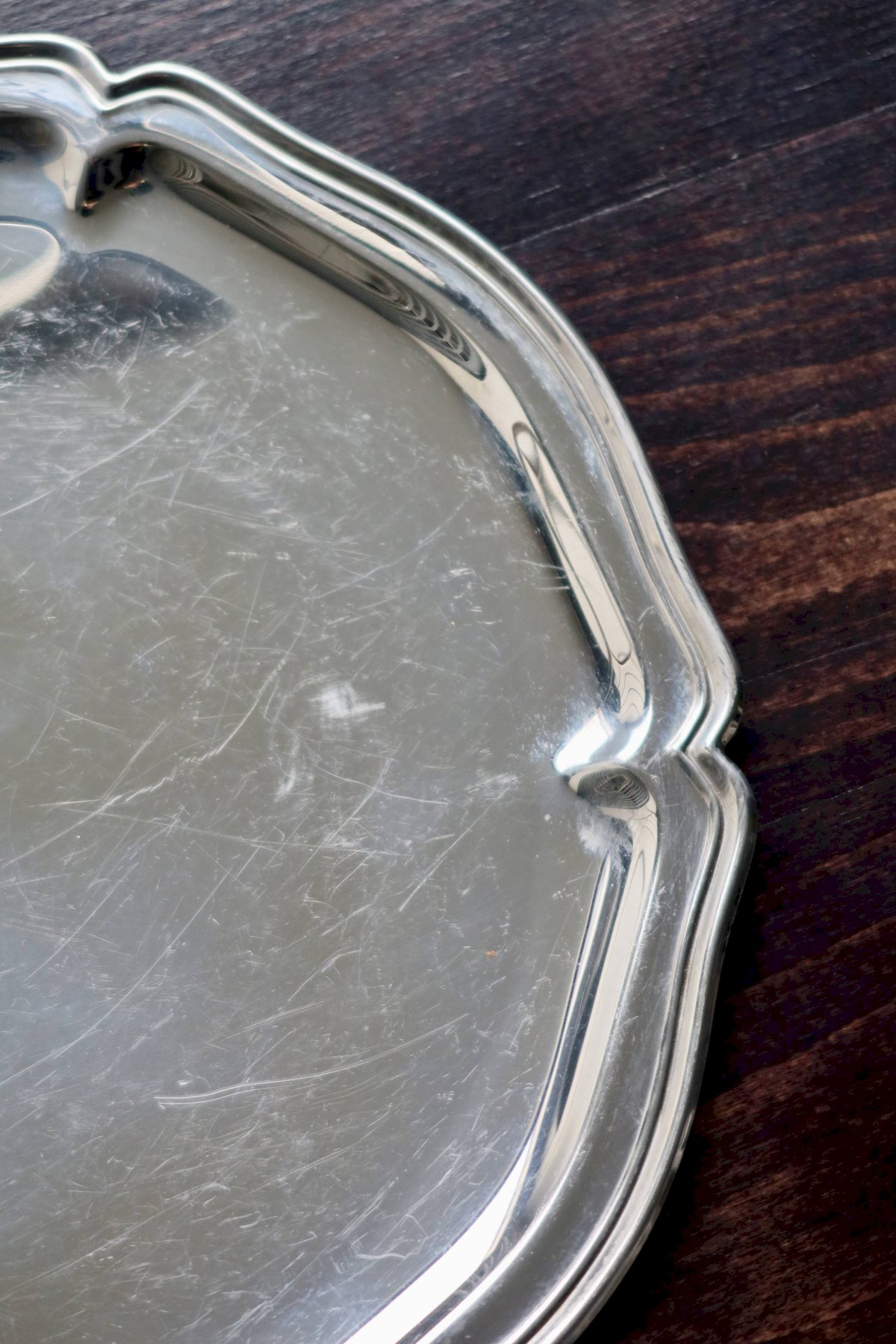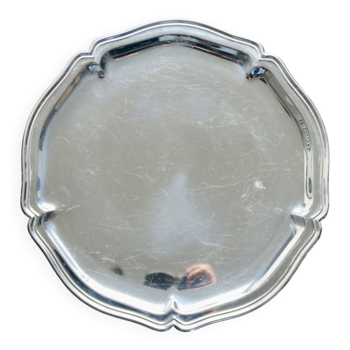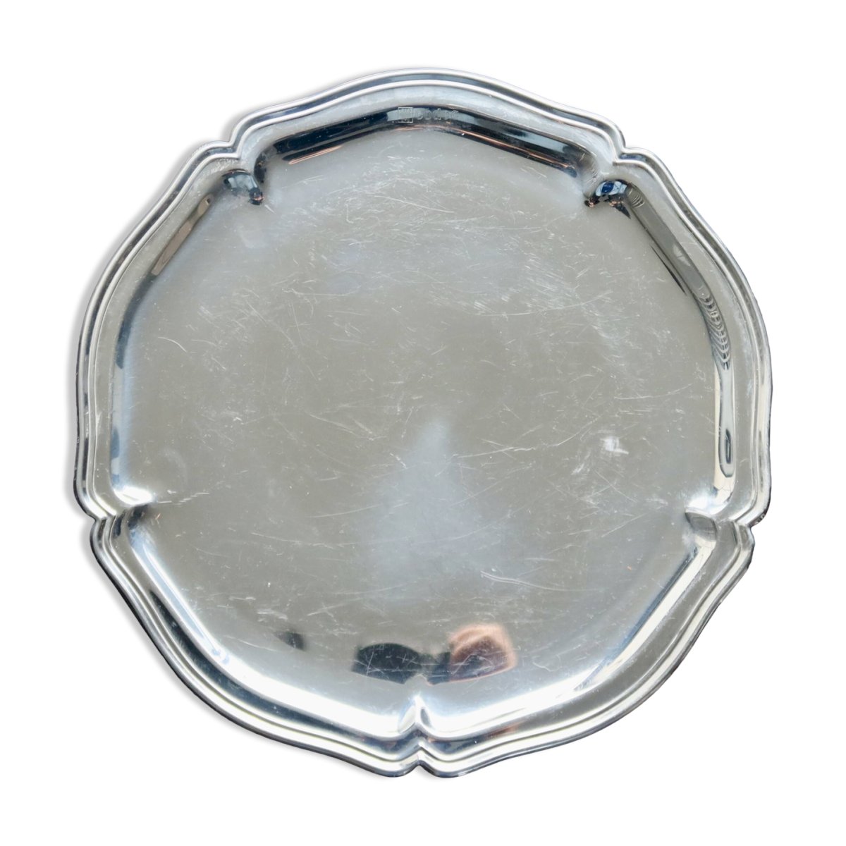 Superbe plateau rond à bord chantourné double filets, en acier inoxydable brillant.