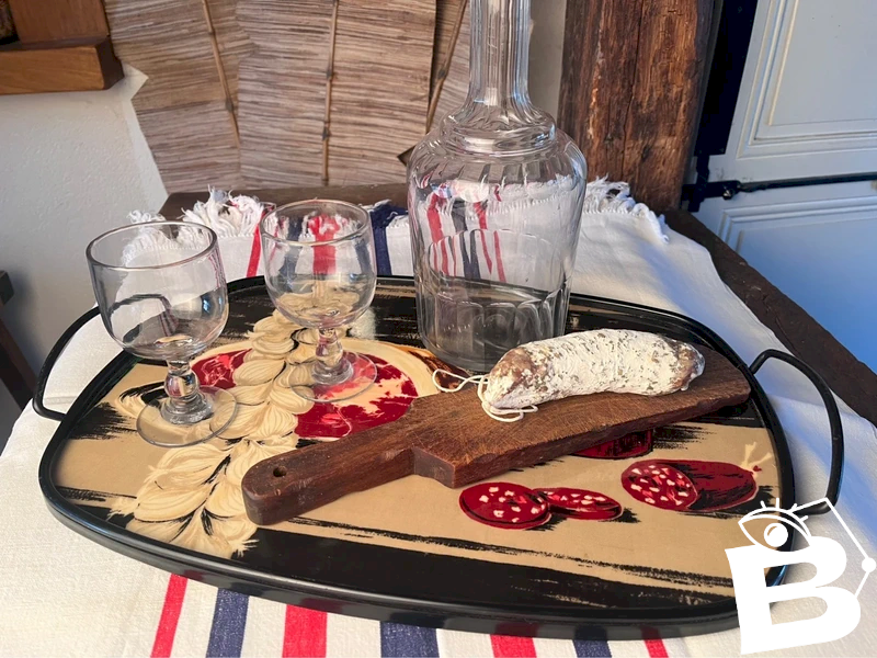 (Aïl, vin et charcuterie) Cerclé de plastique, poignées en métal peint en noir.