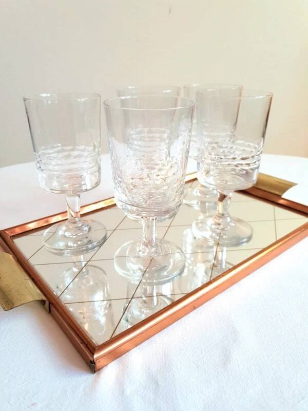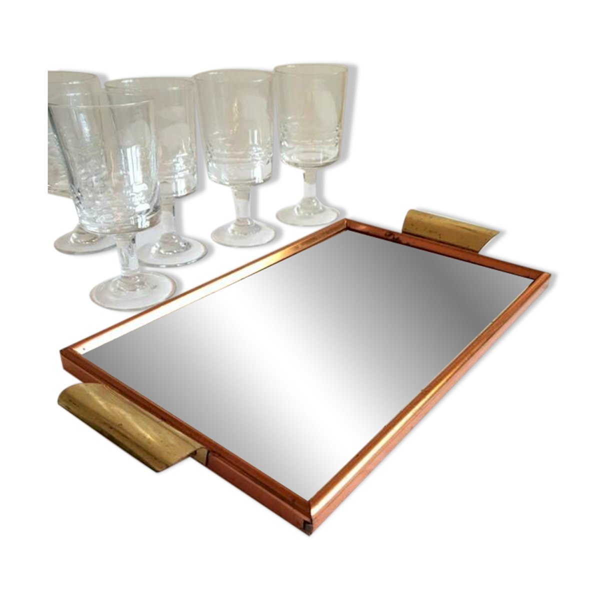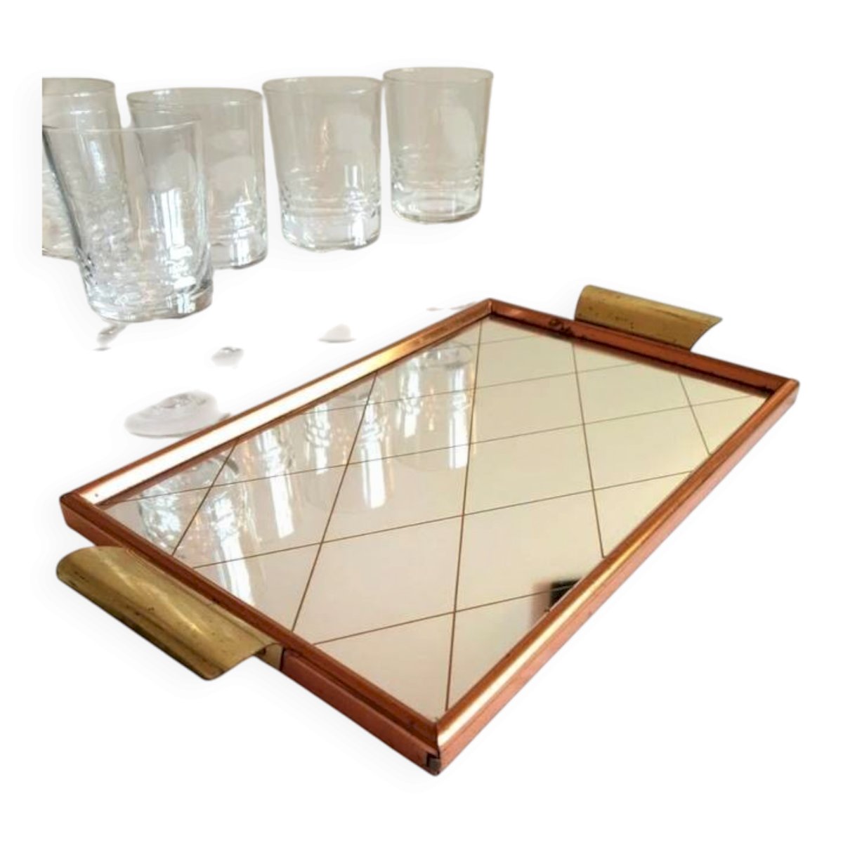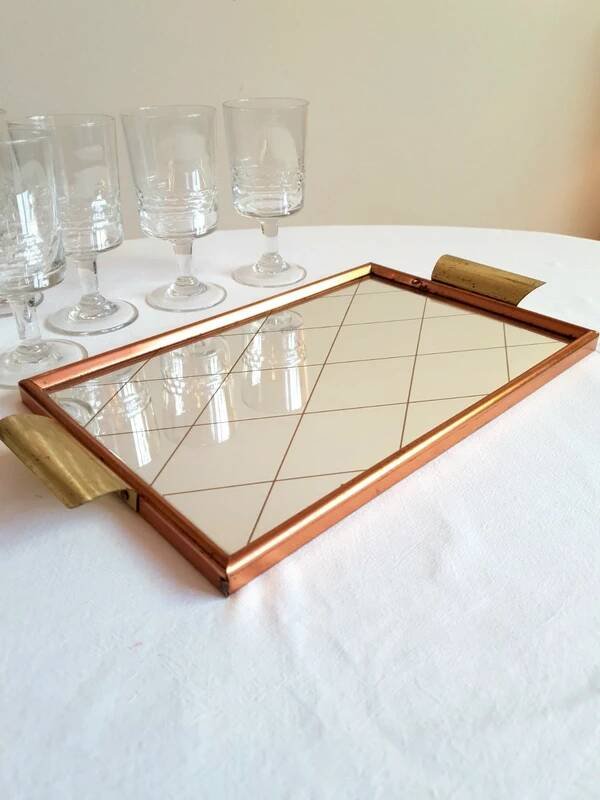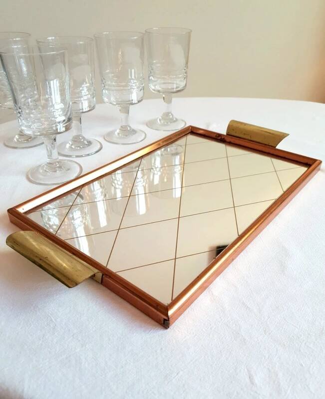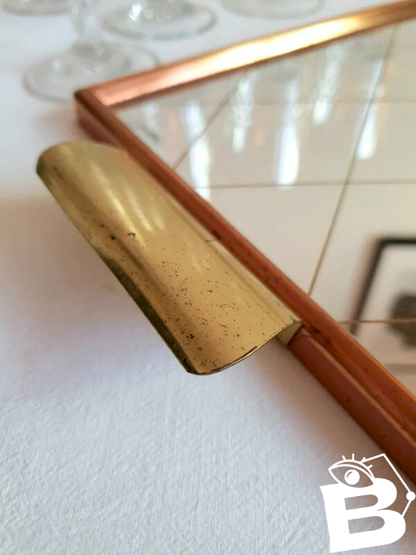 Joli plateau miroir des années 50/60.Poignées en laiton, pourtour en métal rose gold.Miroir au quadrillage doré.Bon état général, légères traces du temps.Dimensions: 37 cm X 20 cm.