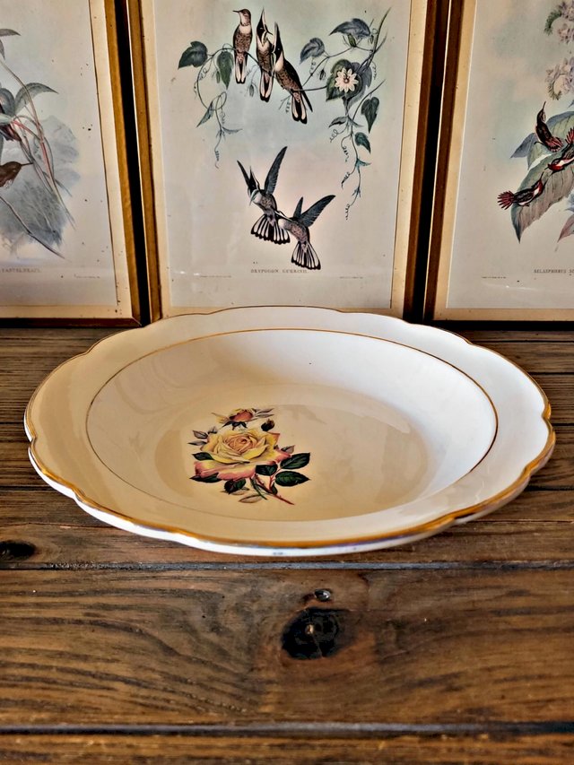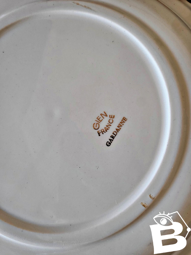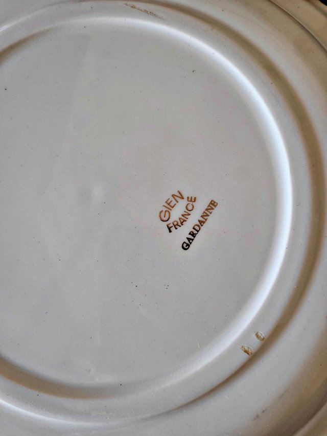 Plats Gien modèle Gardanne: un ovale, un rond creux et un rond plat.Leur décor de roses jaunes, associé à deux liserés dorés, apporte une touche raffinée et lumineuse à une table du quotidien comme aux grandes occasions.Les bords légèrement festonnés renforcent l’élégance du modèle.Les deux plats ronds sont en bel état général, avec de légères marques d’usage liées au temps et à l’utilisation (traces de couvert).