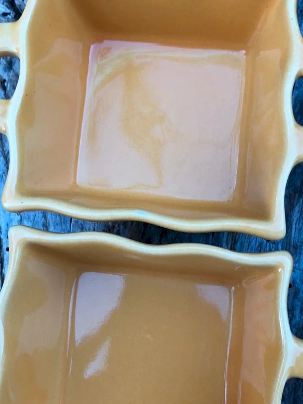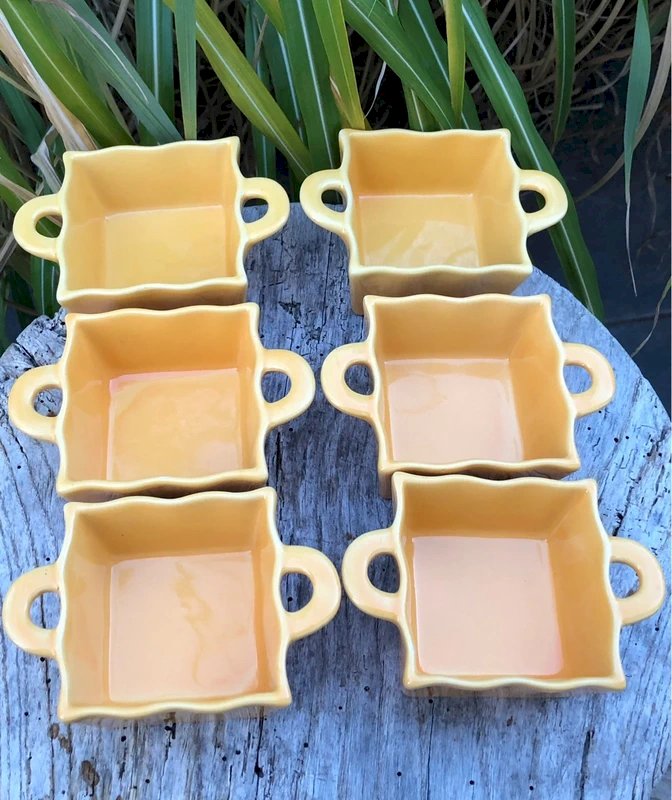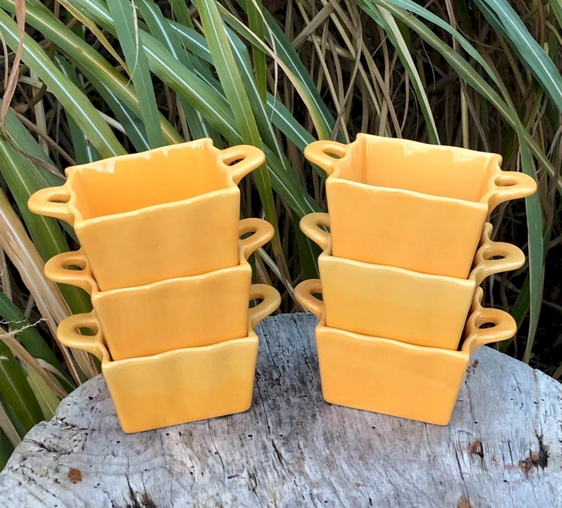 6 Plats individuels jaunes en excellent état Neufs mais vont au four Hauteur 5 cm Dimensions 8*8 cm