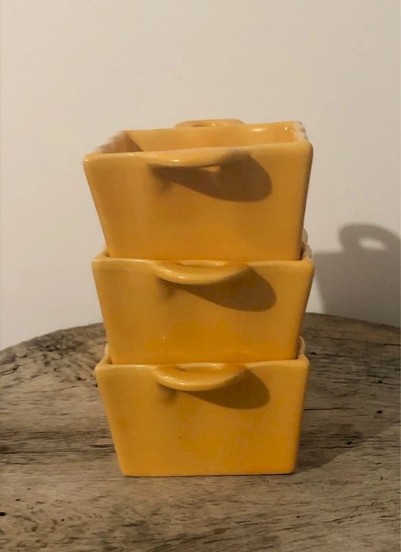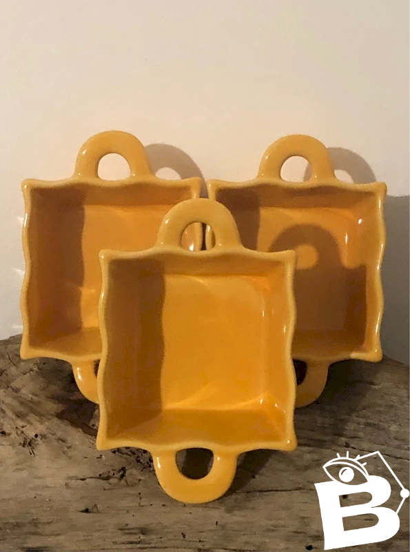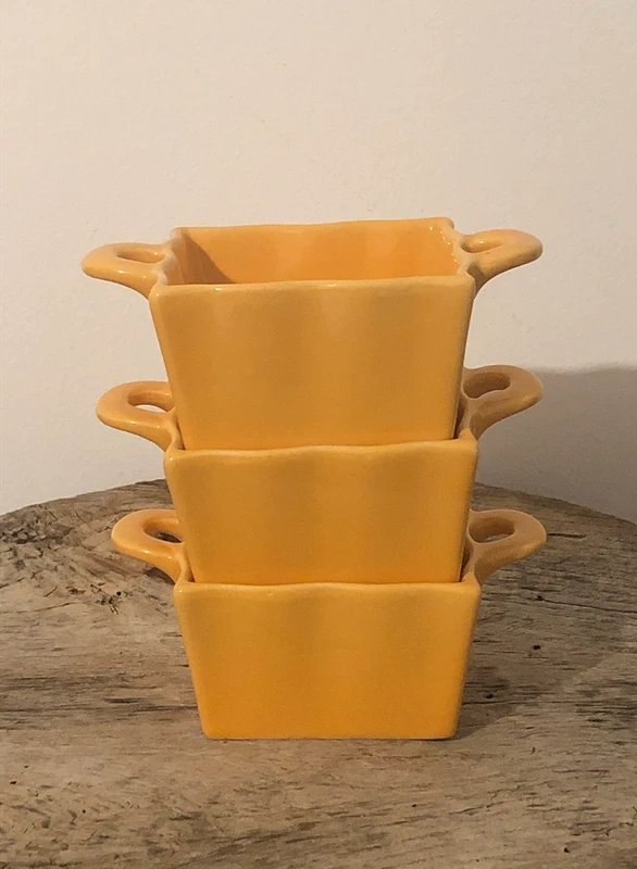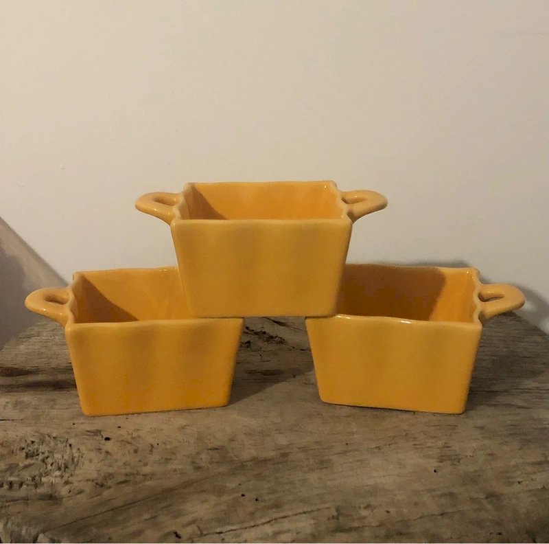 3 Plats individuels jaunes en excellent état Neufs mais vont au four Hauteur 5 cm Dimensions 8*8 cm