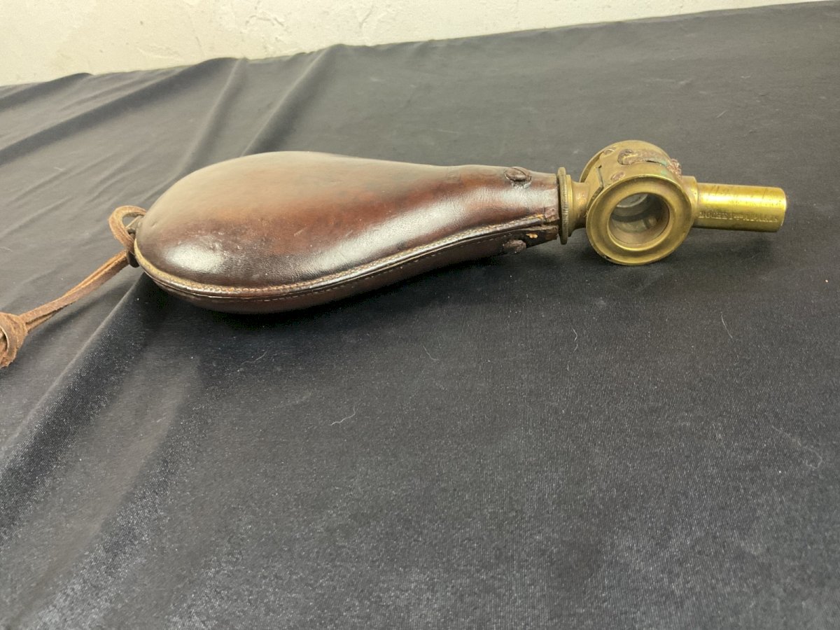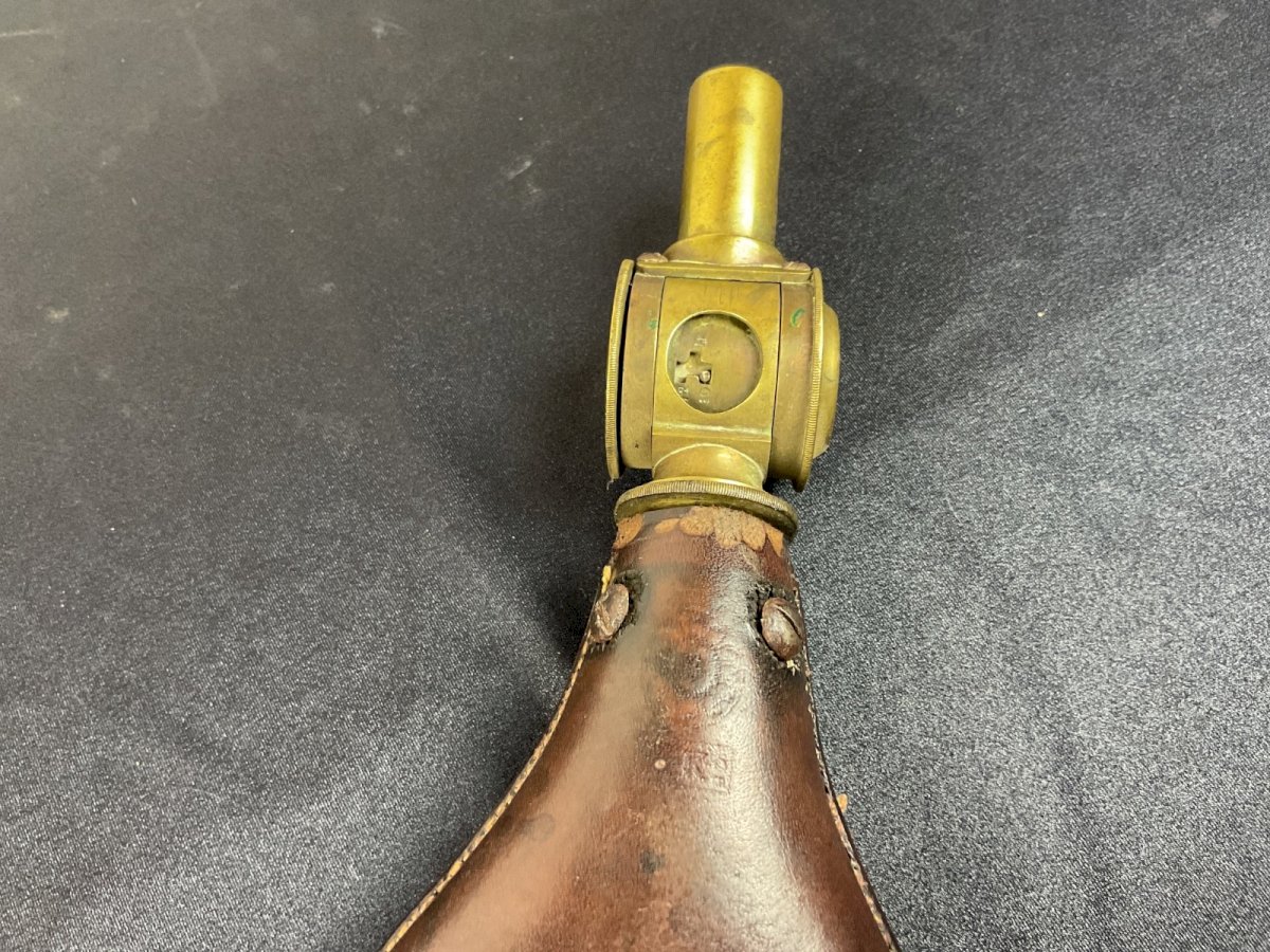 POIRE A POUDRE MILITAIRE XIXEME  BOCHE PARIS   Bec automatique par tambour rotatif  3 unités de mesure  Un anneau de portage Hauteur : 23 cm Authenticité:Original Type:Objet d'art populaire Origine:France Sous-type:POIRE A POUDRE Matière:laiton cuir