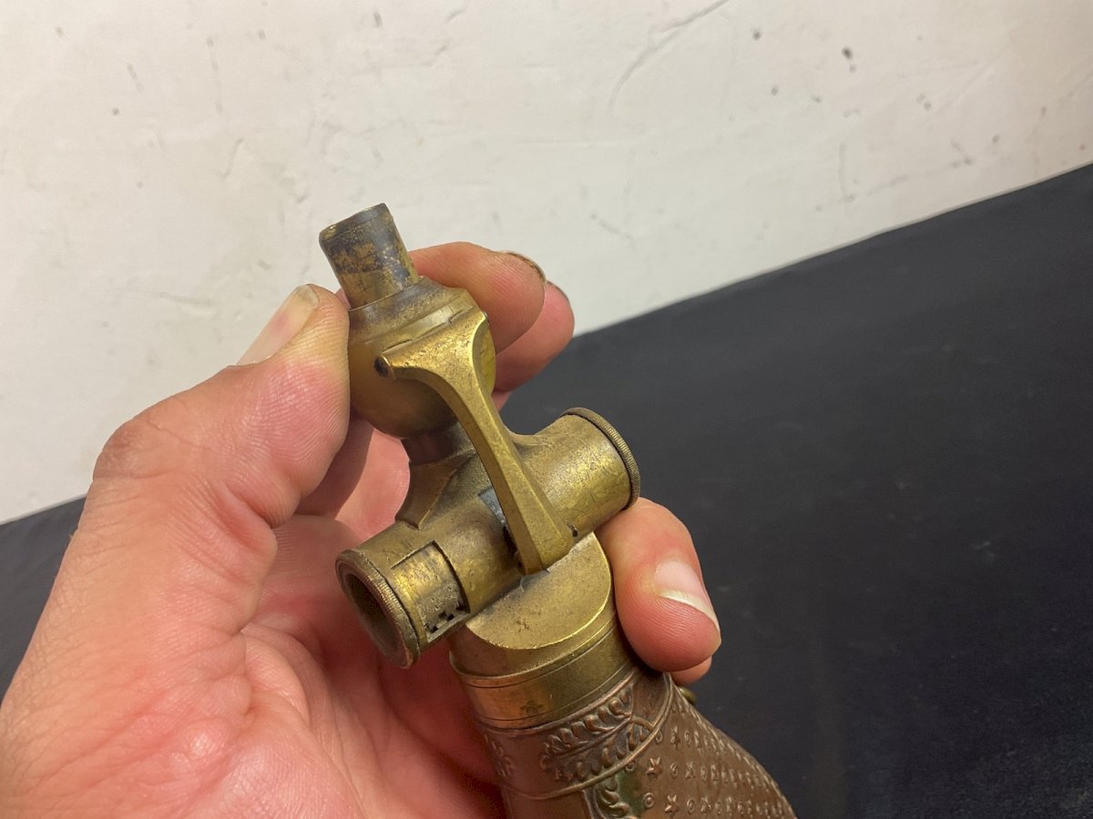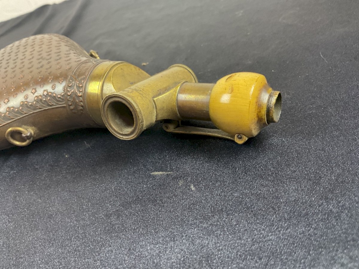 POIRE A POUDRE MILITAIRE XIXEME  BOCHE PARIS   Alimentation par coulissant et précision  3 unités de mesure  Hauteur : 20,5 cm Authenticité:Original Type:Objet d'art populaire Origine:France Sous-type:POIRE A POUDRE Matière:laiton cuir