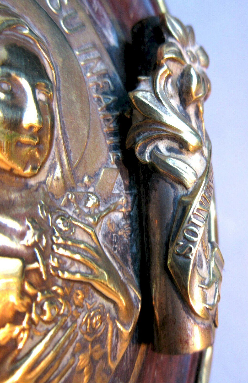 Porte-buis, style Napoléon III, époque début XXème. Ravissant porte-buis en laiton doré représentant Sainte Thérèse de Lisieux et un porte-bouquet creux pour le buis avec inscription gravée: Souvenir de Lisieux. Ce porte-buis est posé sur un médaillon ovale en acajou entouré d'un liseré de laiton doré. A l'arrière, une chainette pour le suspendre. Bon état général. Dimensions: 9 cm sur 7 cm. Superbe objet authentique à collectionner ou à offrir. Authenticité:Original Type:Objet de vitrine, Décoratif Origine:France Sous-type:porte-buis Pays d'origine:France Style:Napoléon III Matière:Laiton
