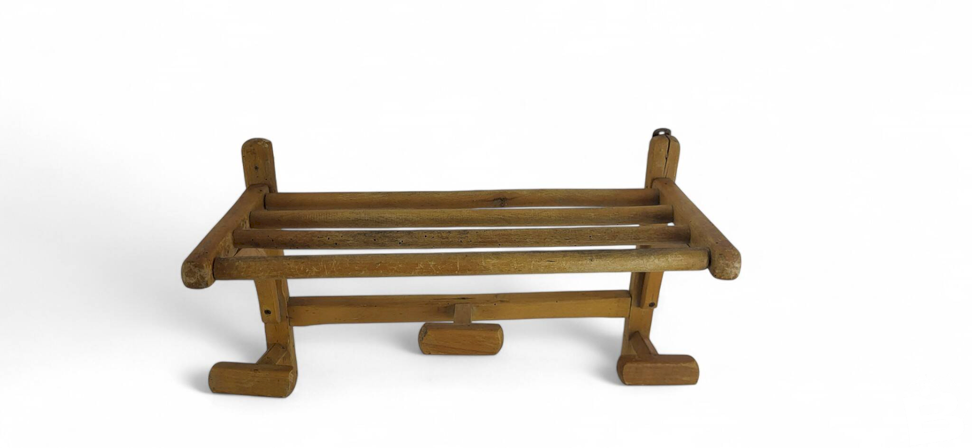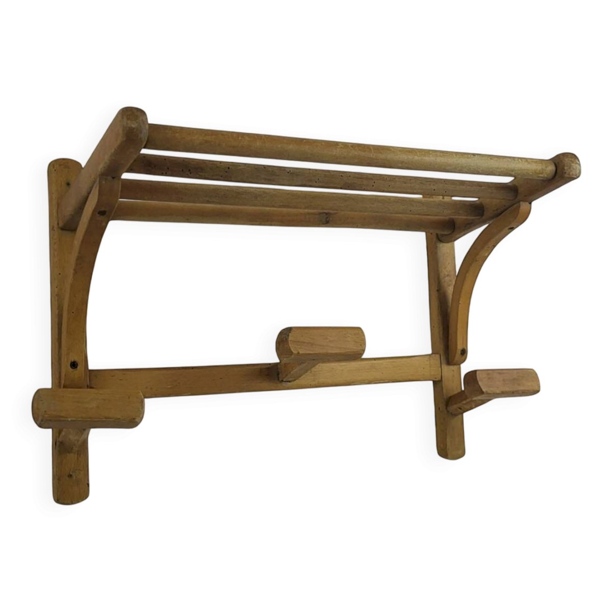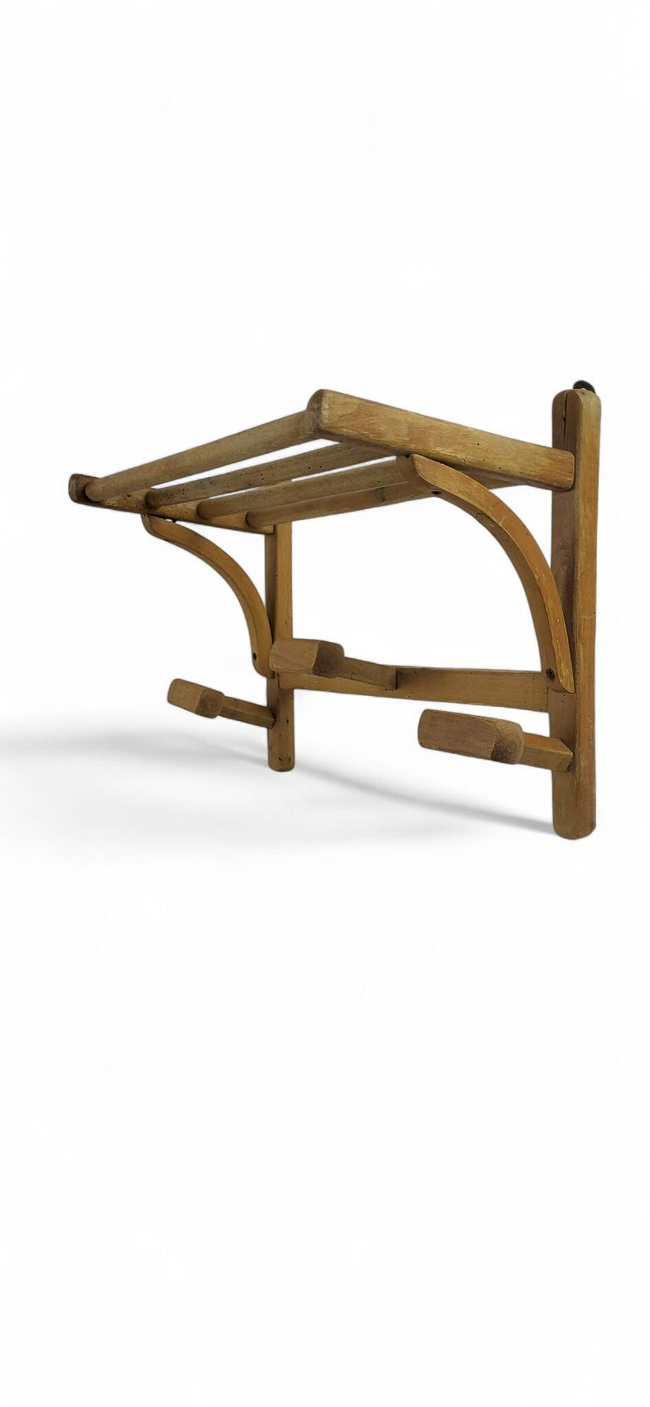 Porte manteau mural 1950's, en bois.Largeur 50 cm.Hauteur 34 cm.Profondeur 25 cm.Vernis ancien et patiné.En bon état général avec traces d'usage et d'ancienneté minimes.Emballage soigné et livraison rapide.