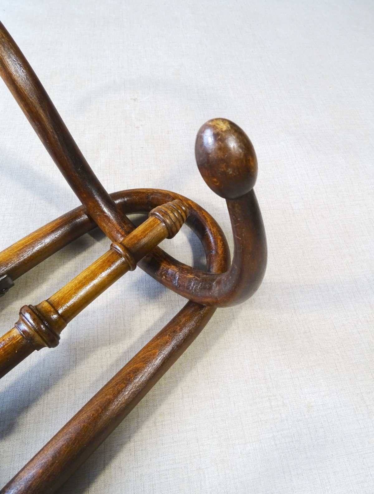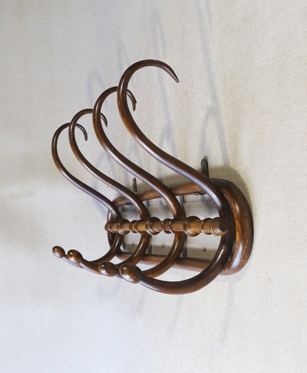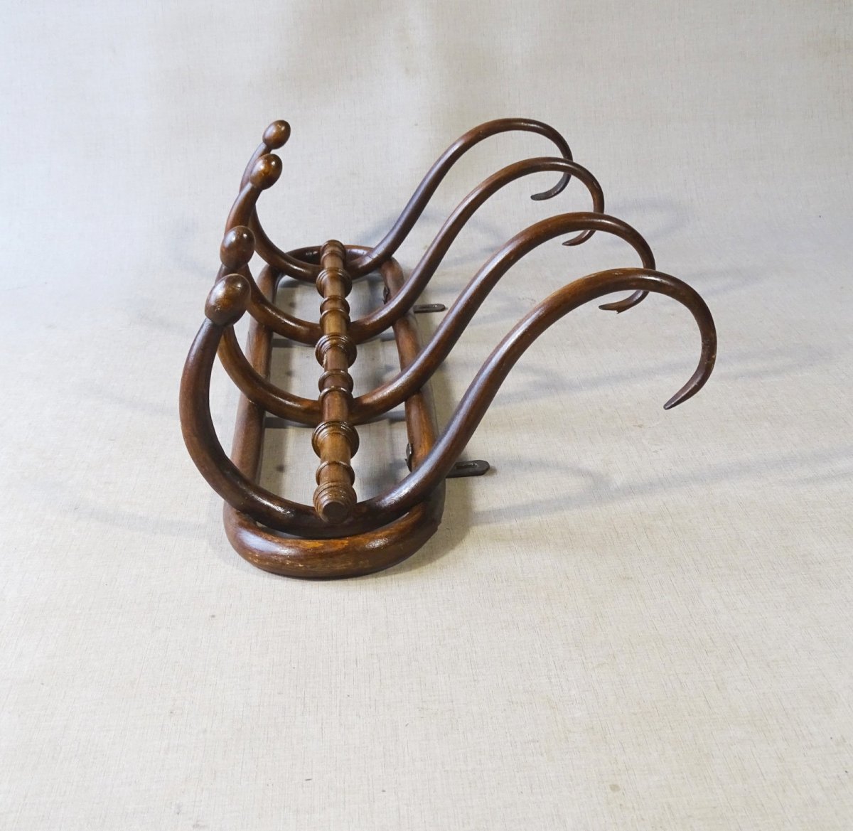 Porte-manteaux mural à 4 esses de Kohn vers 1910. Beaucoup plus rare que les porte-manteaux de Thonet ou Fischel, bien différents.   Il n’est pas estampillé mais ses formes le signent, les extrémités des crochets sont en forme d’olive. Teinte noyer d’origine, belle patine naturelle.   Il existait à 3 crochets, 4 ou 5 selon la demande.   Solide et en état d’origine. Il a ses deux crochets de suspente. Dimensions : 74 cm X 37 cm X 20 cm   Plus de photos et renseignements sur demande.   Expédition France et Europe ou retrait Alsace. Nombre de pièces:1 Couleur:Noyer Type:Porte- manteaux mural Marque:Kohn Origine:Autriche Matière:Hêtre