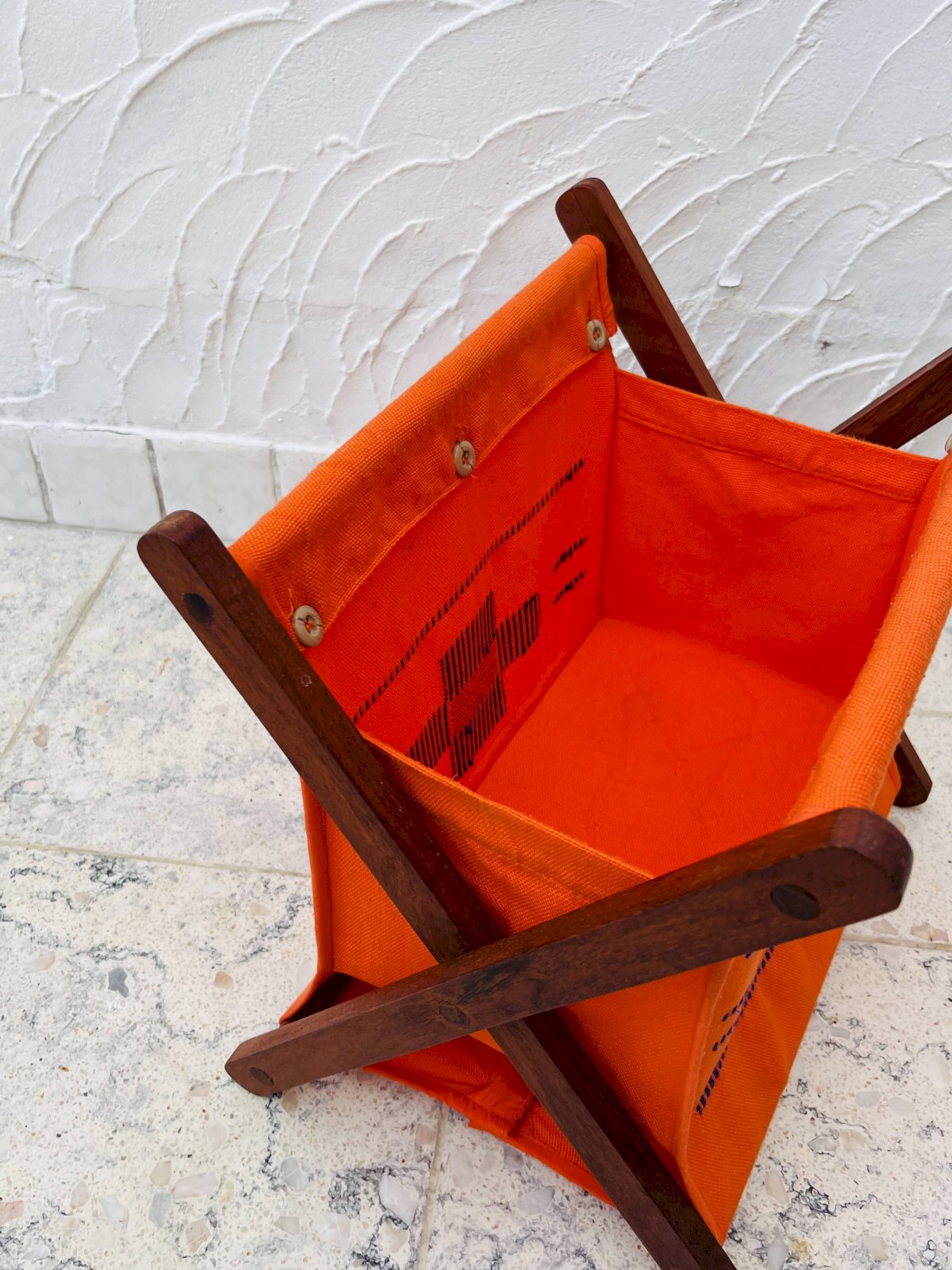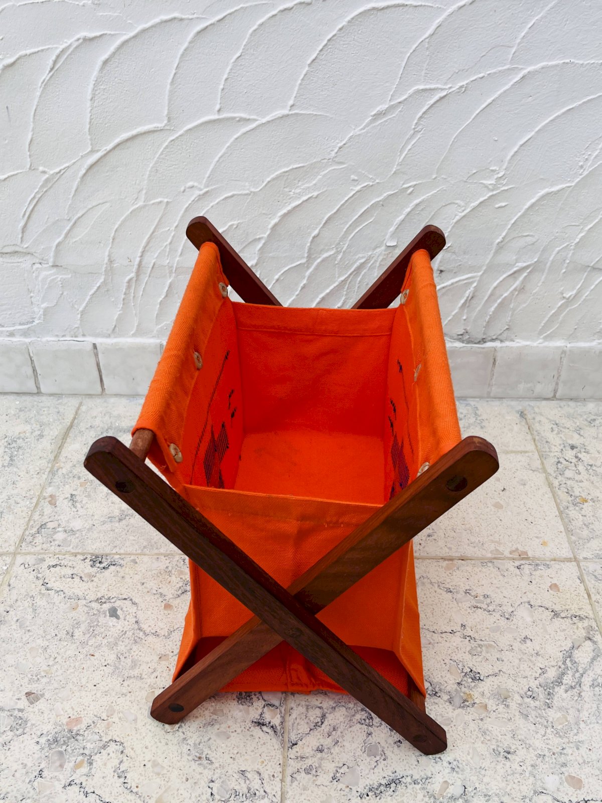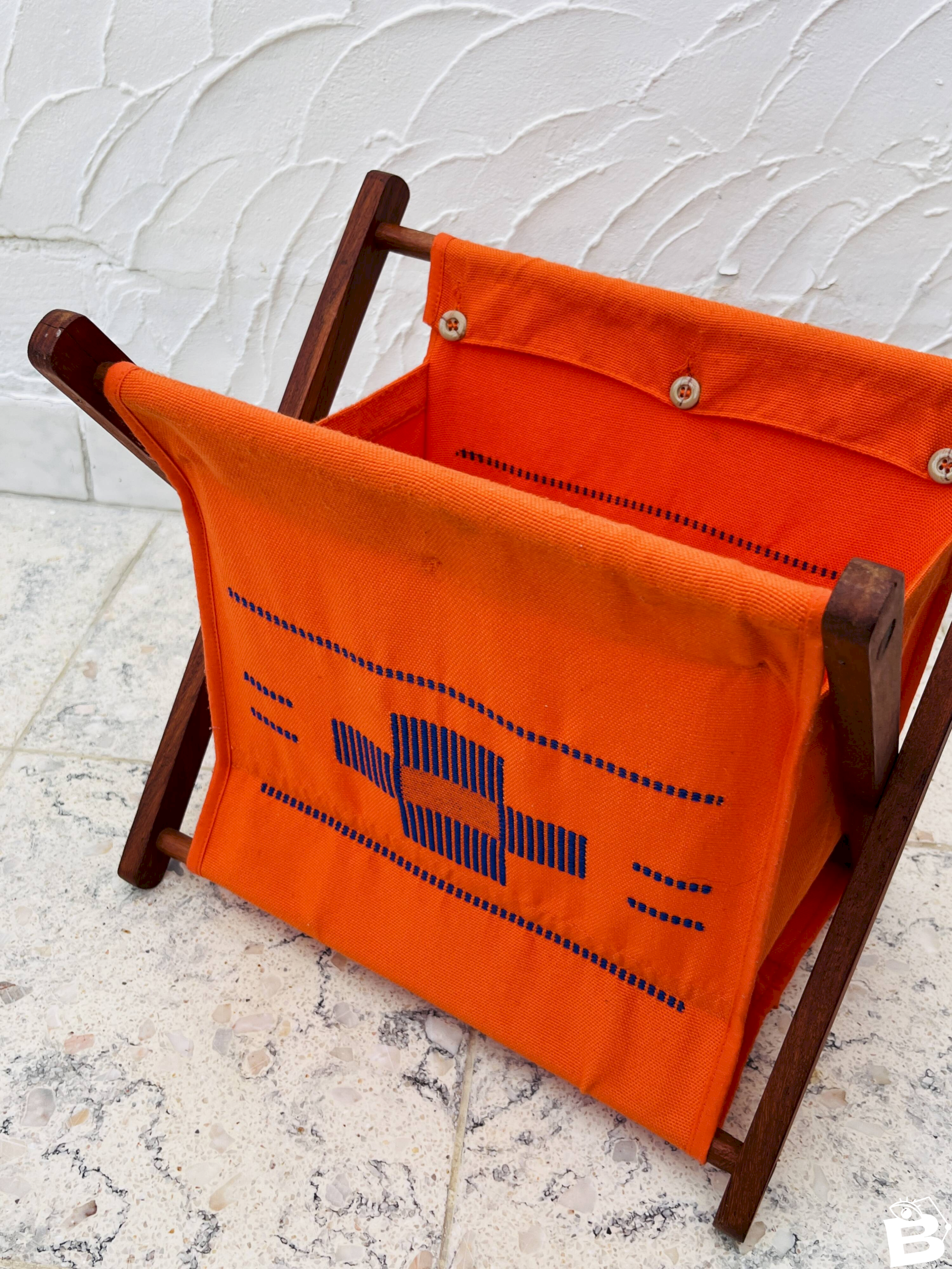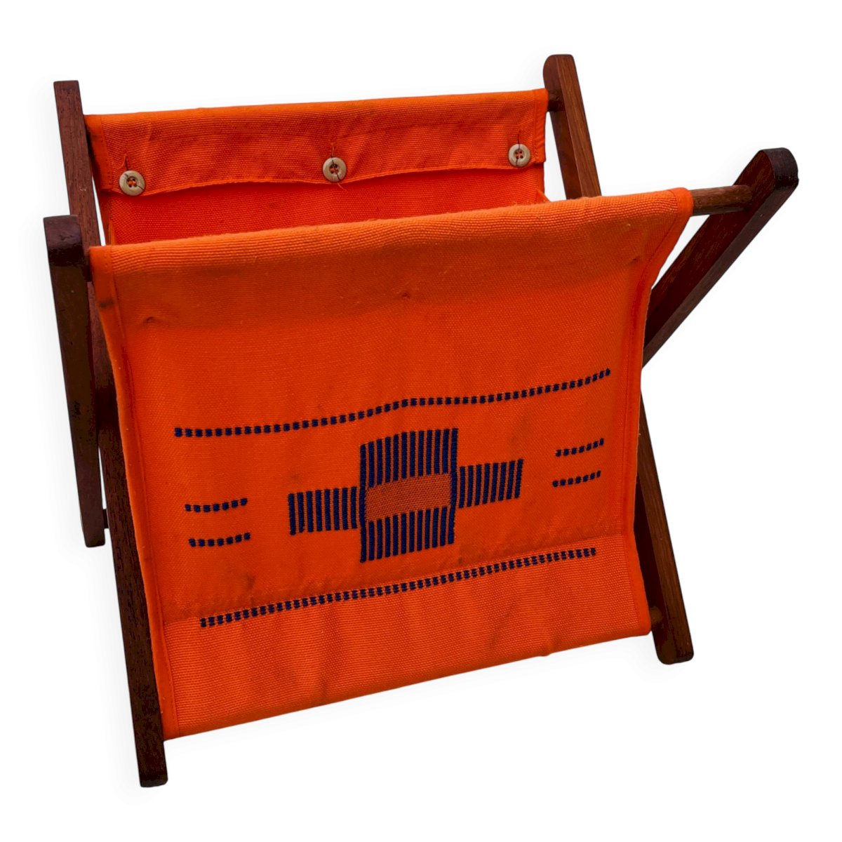 Fabriqué avec une structure en bois robuste et un textile orange vif, il est à la fois fonctionnel et décoratif.Le tissu orange éclatant est orné d'un motif géométrique, offrant un contraste visuel saisissant avec le bois brun profond.Son design pliable facilite le rangement et le transport, ce qui en fait un accessoire polyvalent pour n'importe quelle pièce.Idéal pour ranger magazines, journaux ou même petits livres, ce porte-revues allie praticité et style vintage.Embellissez votre intérieur avec ce porte-revues unique, un mélange parfait de forme et de fonction.Dimensions: 33 X 27 X H 32 cm.