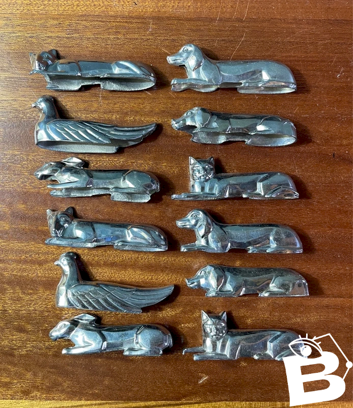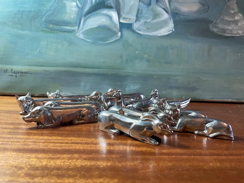 12 Porte Couteaux en métal chromé Marcel Sandoz Art Déco 6 animaux différent : poule, cochon, lapin, renard, chat, chien Le style évoqué est clairement art déco, typique des années 1920-1930, avec une stylisation cubiste des animaux.