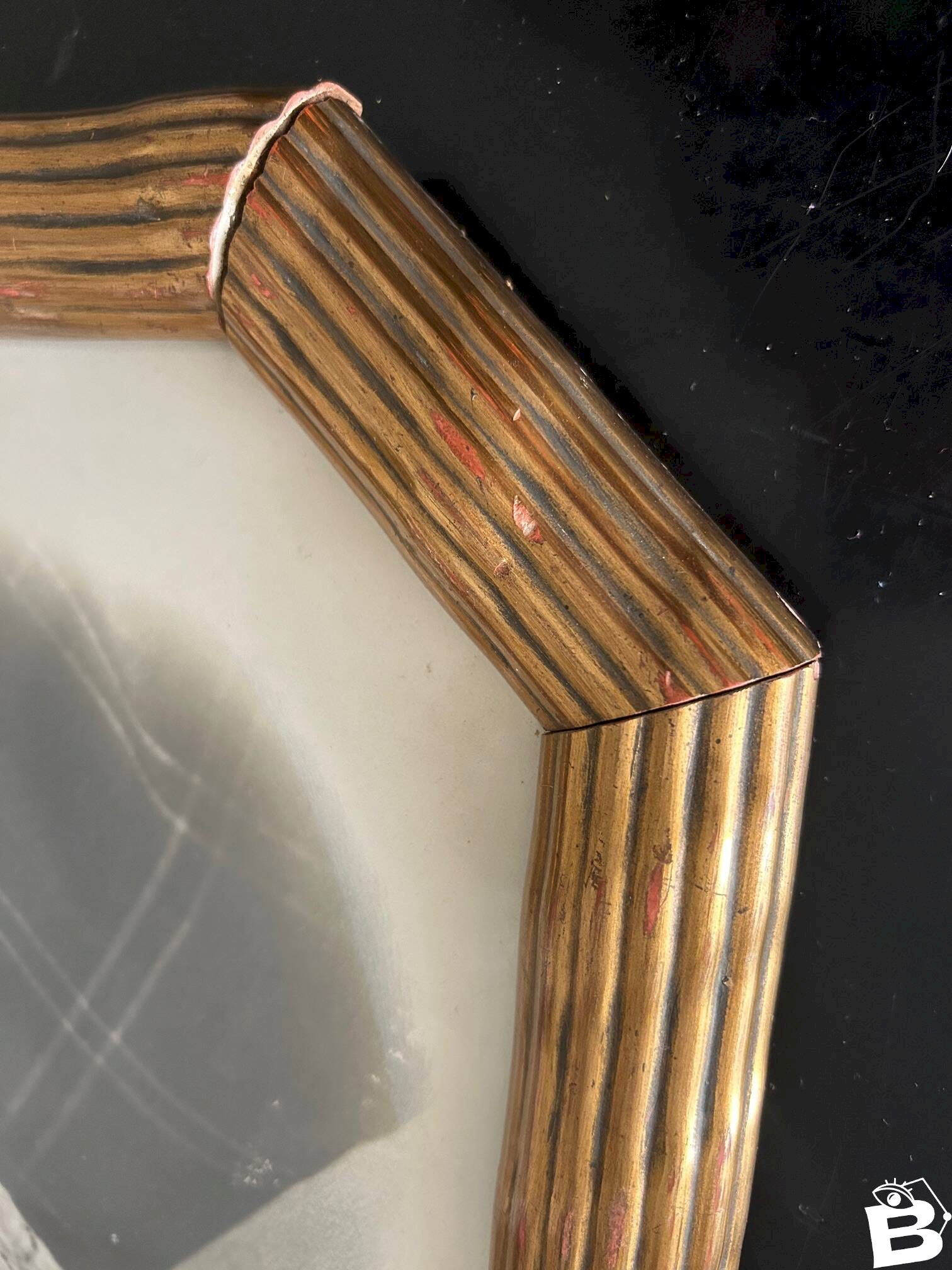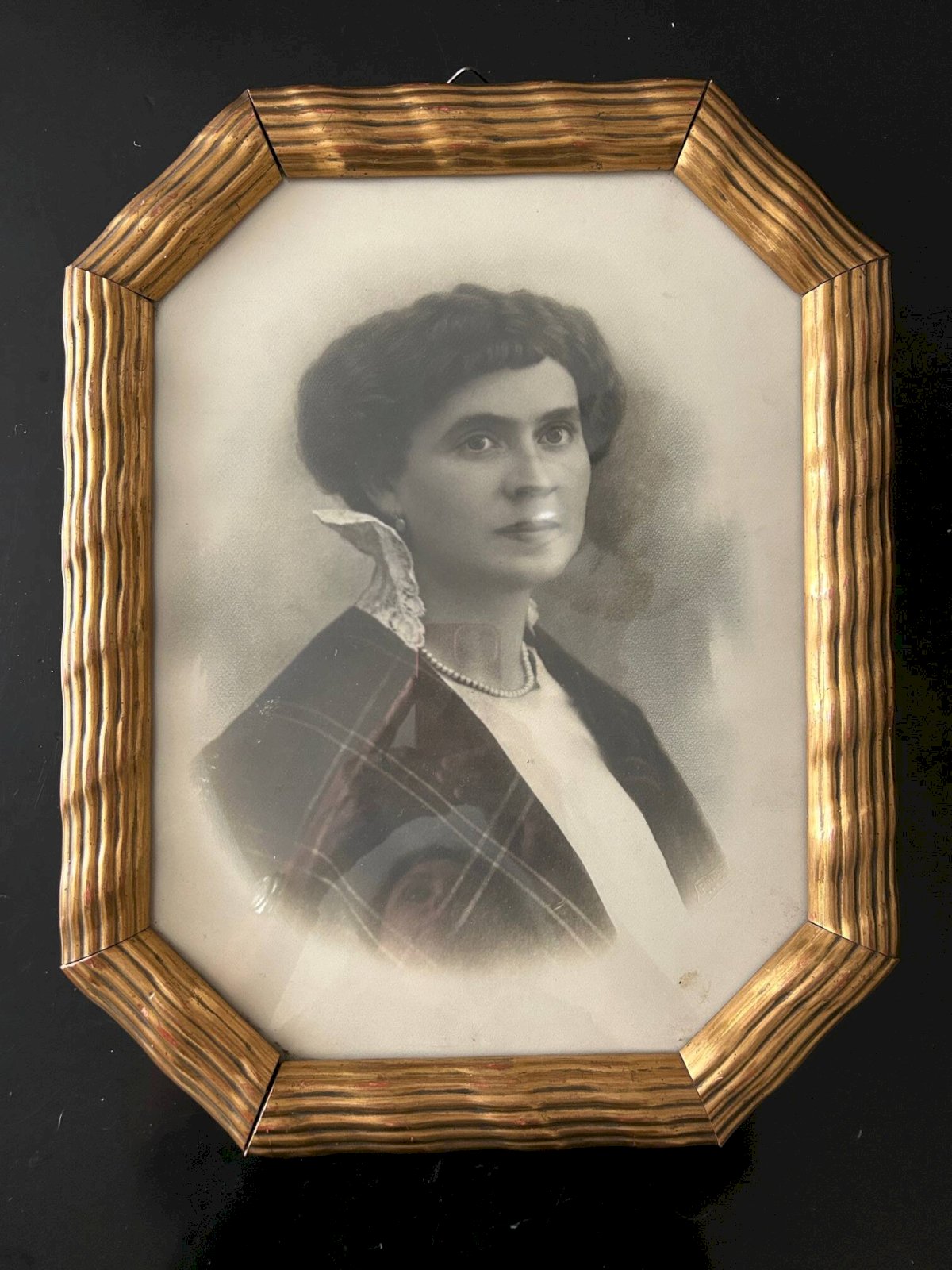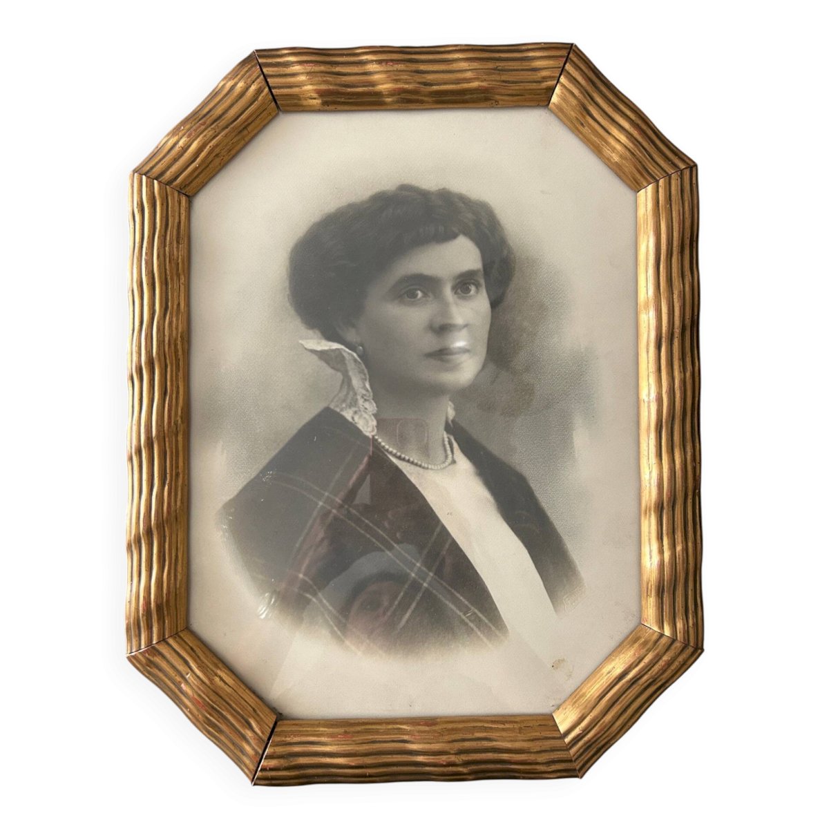 Magnifique cadre en laiton repoussé sur bois des années 20.Portrait d'origine.