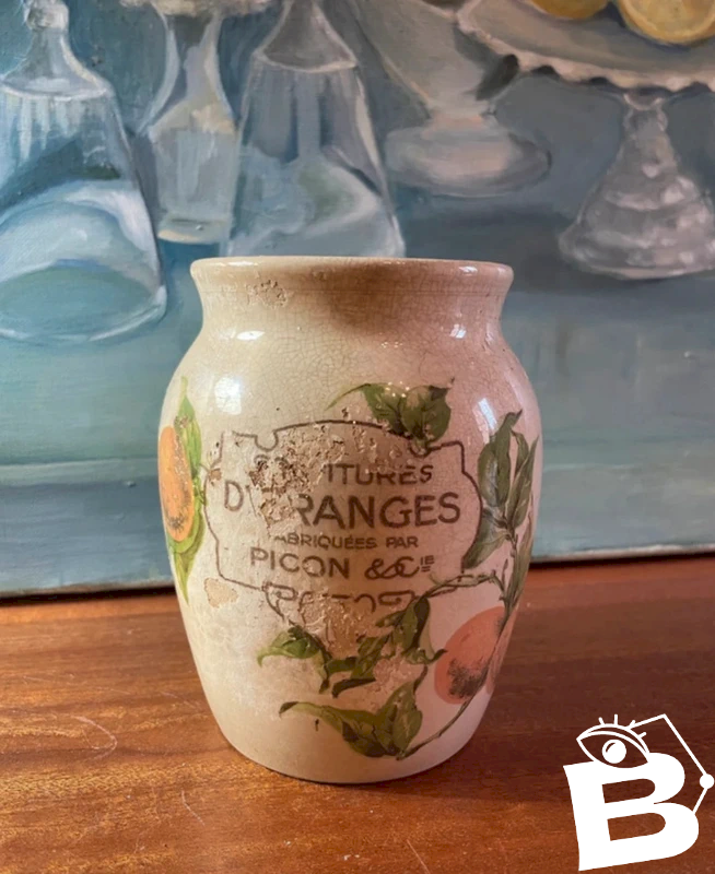 ancien pot à confiture vintage, verre épais à côtes plates, signé F.P. Déposé