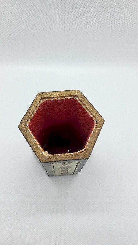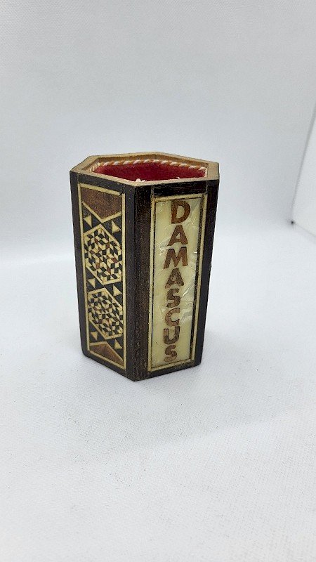 joli pot à crayons stylos marqueterie Damascus il est en bon état il y a un très beau travail il mesure 10.5 cm de haut sur 8 cm de diamètre Type:POT A CRAYONS Pays d'origine:France métropolitaine