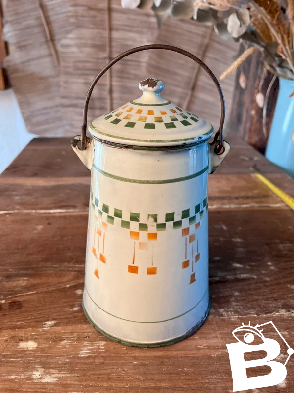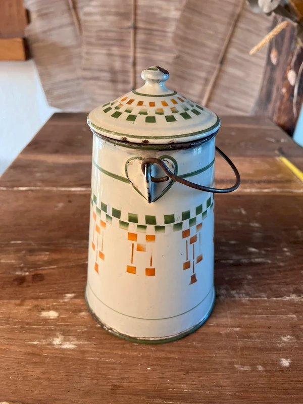 Charmant pot à lait ancien en tôle émaillée et son couvercle.