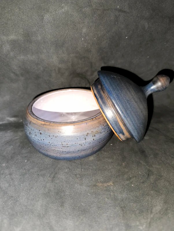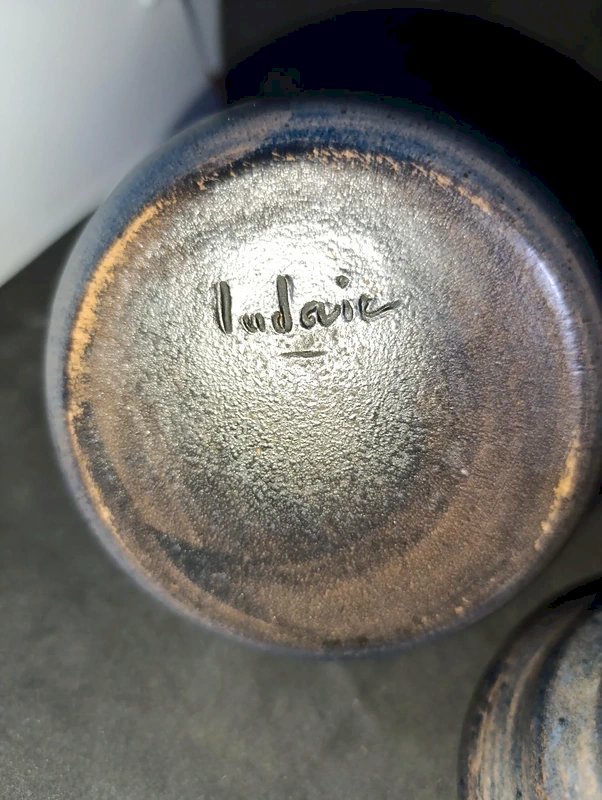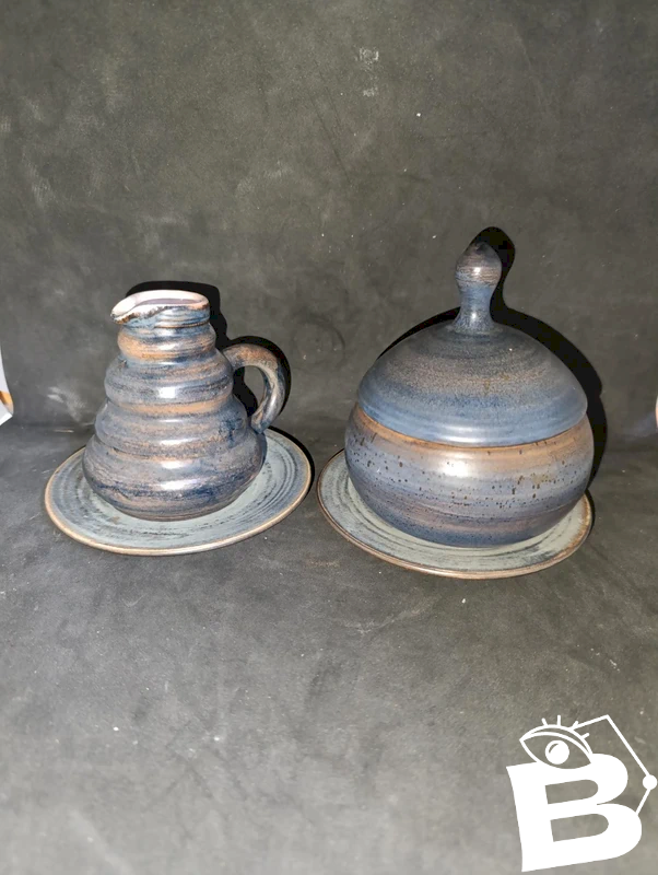 pot à lait, deux coupelles et sucrier en ceramique signé ludovic salins les bains en bon etat hauteur pot à lait 9.5cm et hauteur sucrier 12cm petites usures normales d'usages...