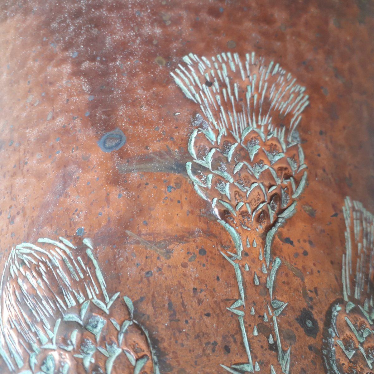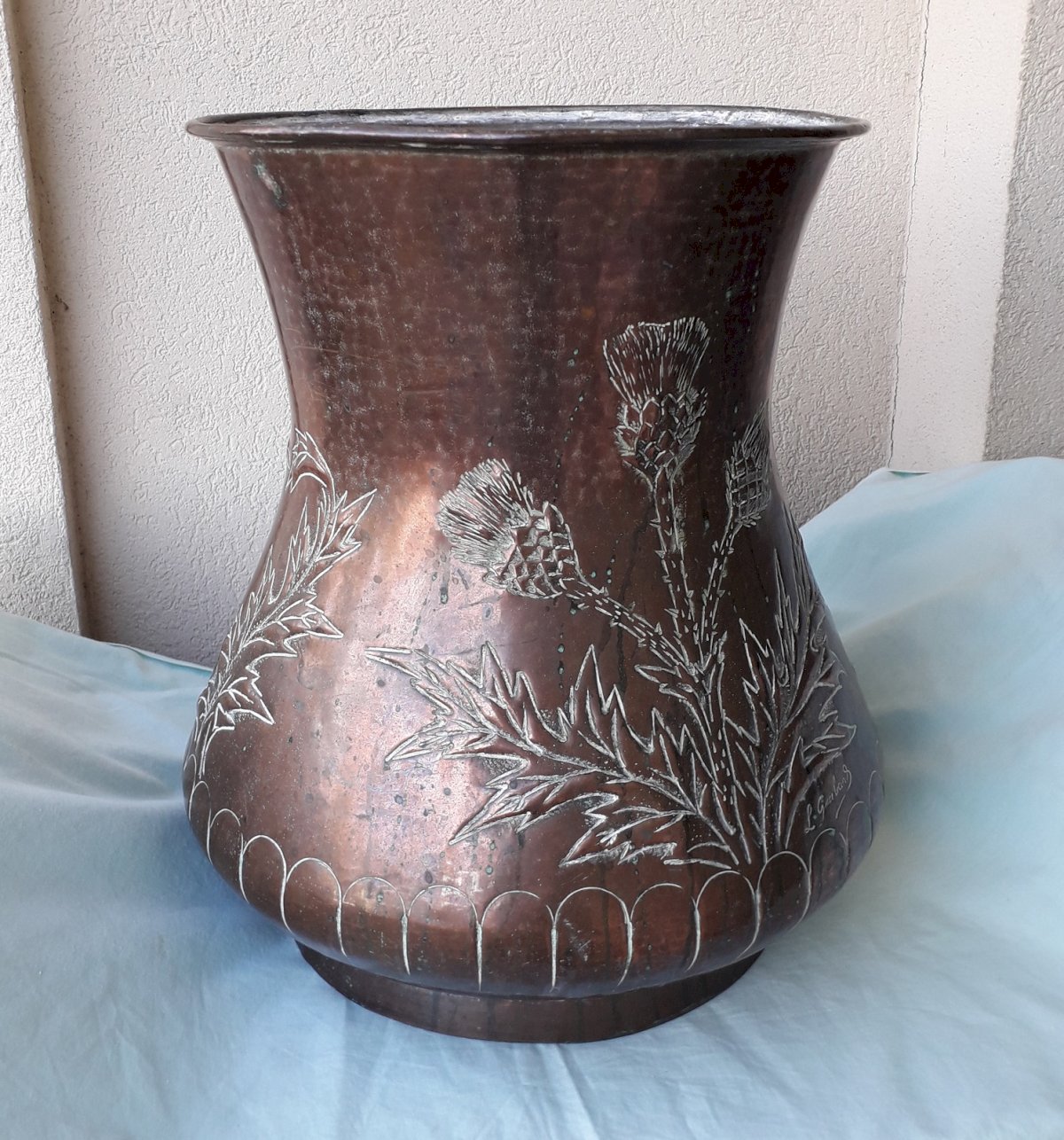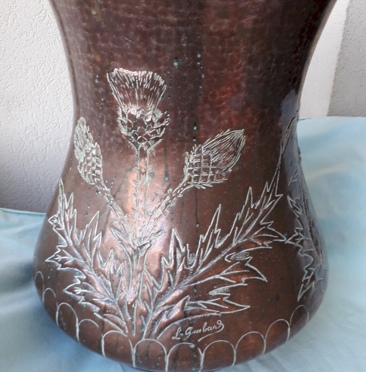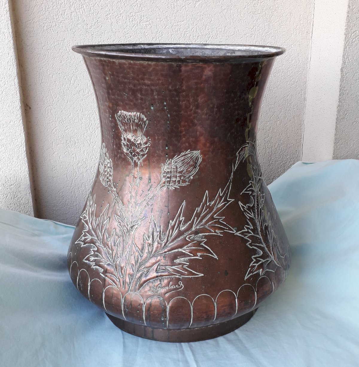 Grand pot en cuivre, à décor de chardon signé "L.Guibard", pouvant servir de porte-parapluie, ou en déco.