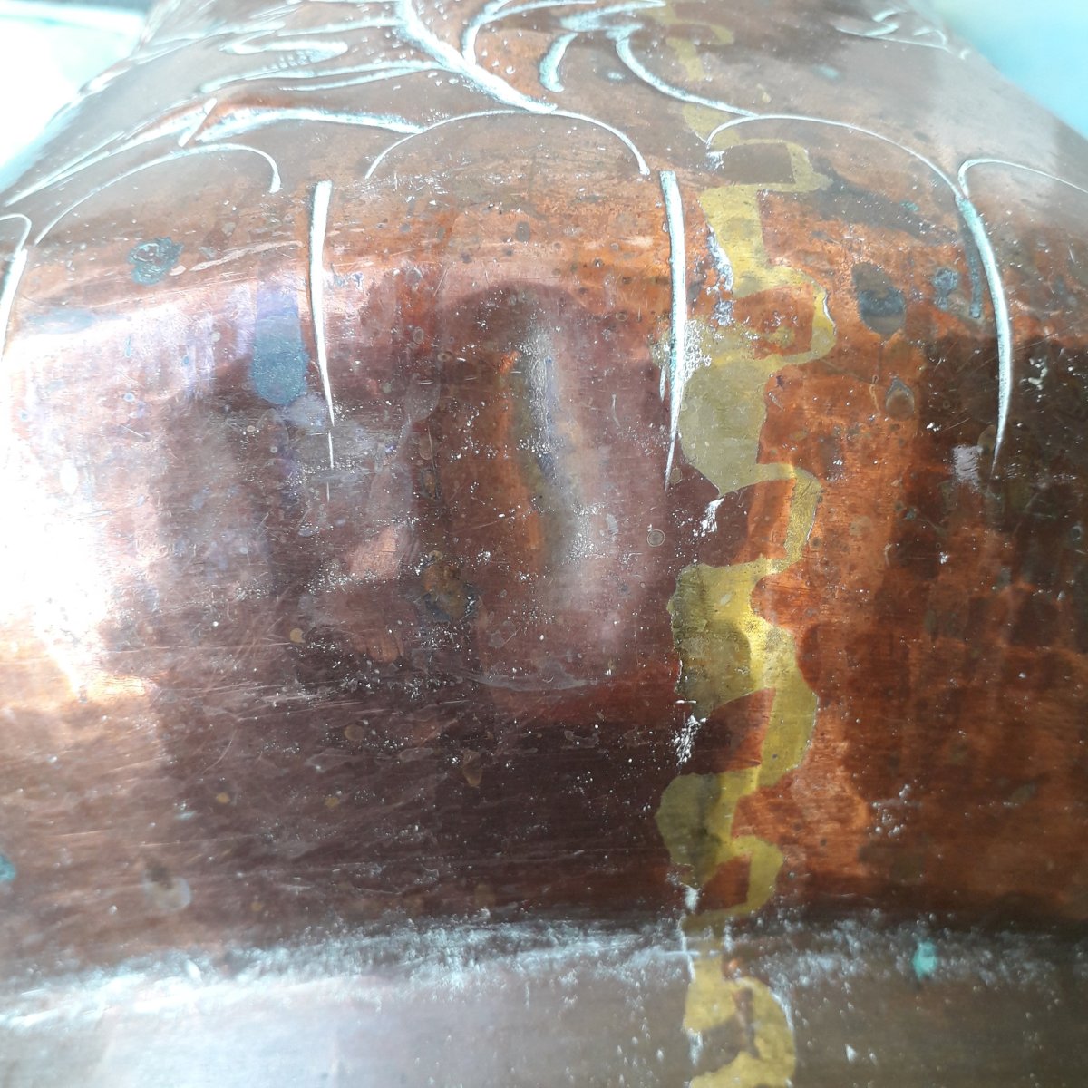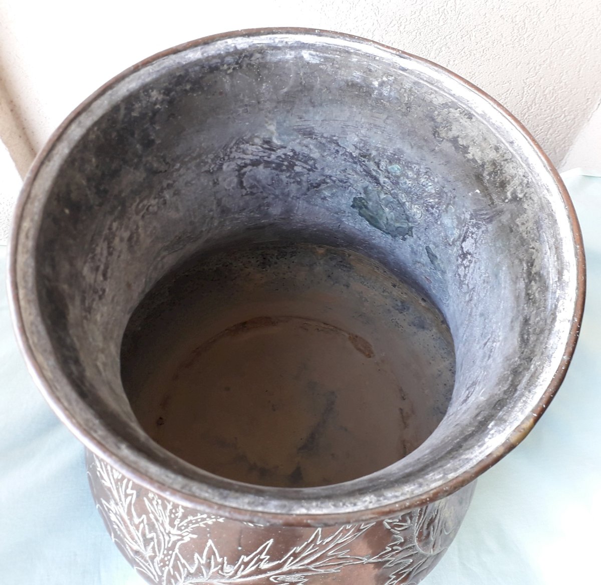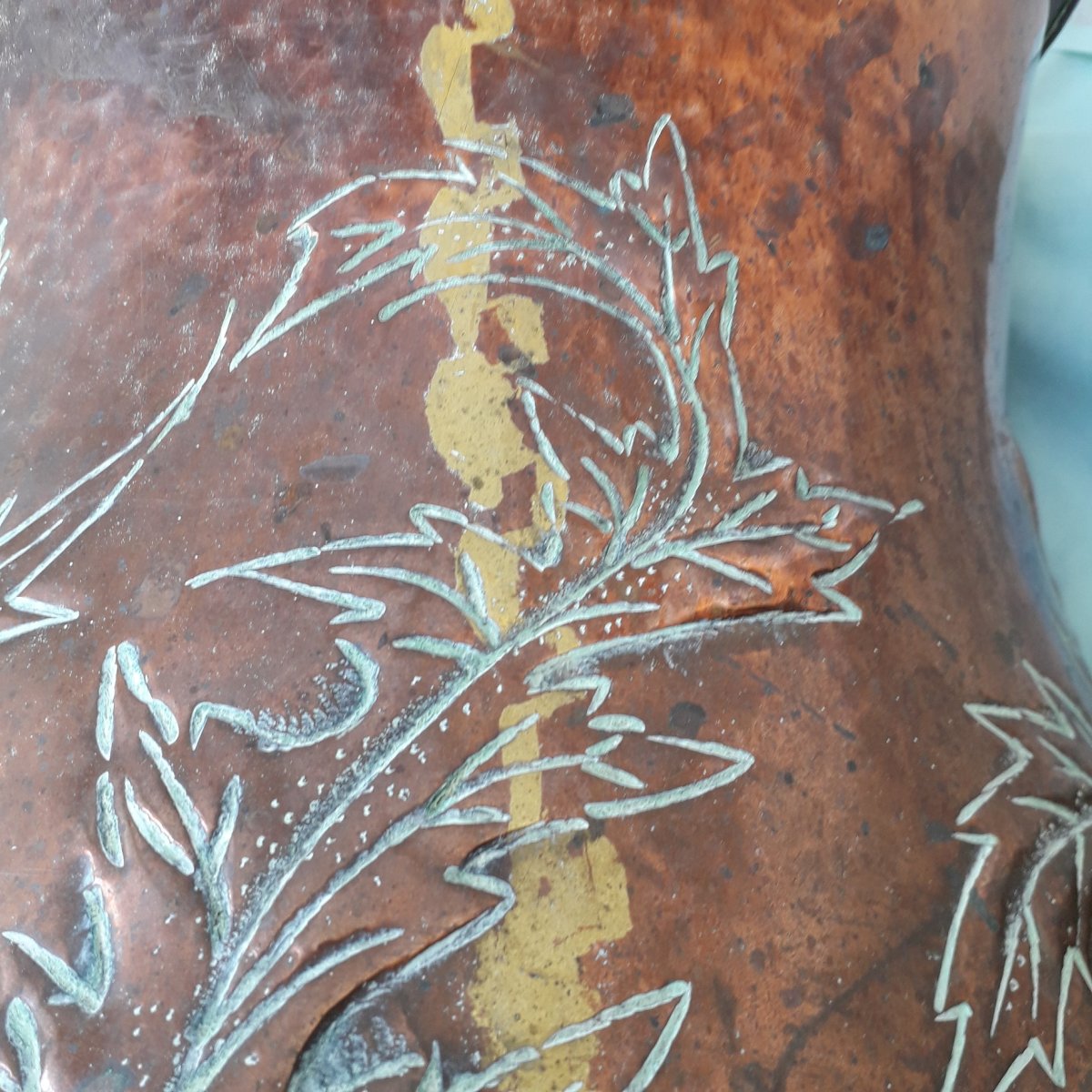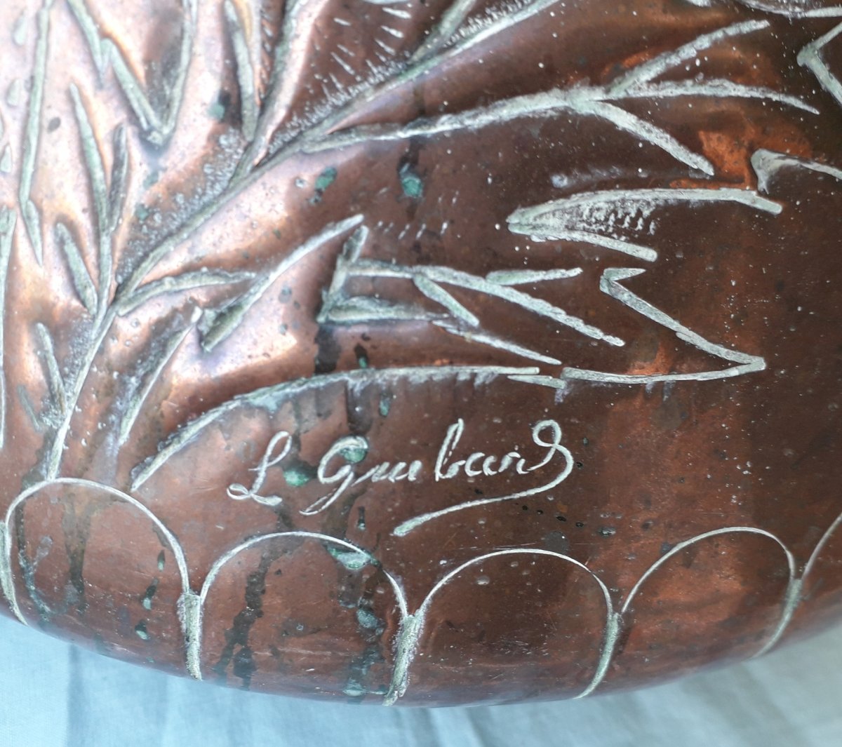 Grand pot en cuivre, à décor de chardon signé "L.Guibard", pouvant servir de porte-parapluie, ou en déco.