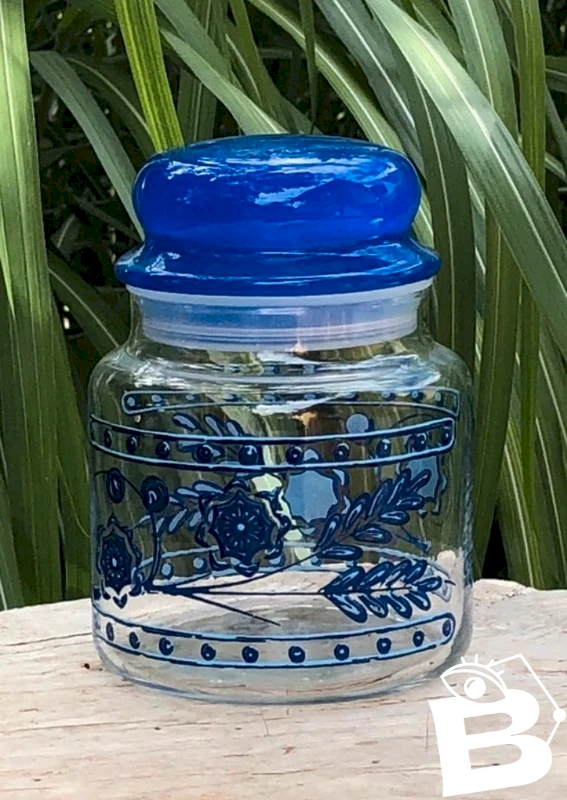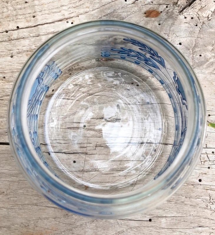 Pot en verre vintage motifs bleus en excellent état Hauteur totale 14 cm Diamètre de la base 10 cm