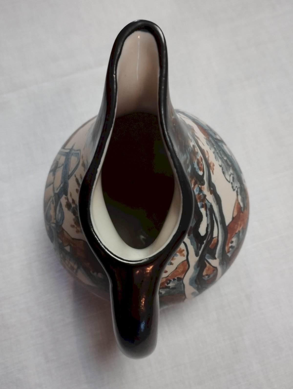 Poterie De Ciboure. Poterie de Ciboure en grès. Décor de femme basque à la fontaine avec sa cruche à eau, réalisé par Madeleine Moreau pendant la période Rodolphe Fischer - 1958 /1975 -.