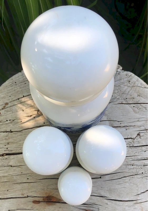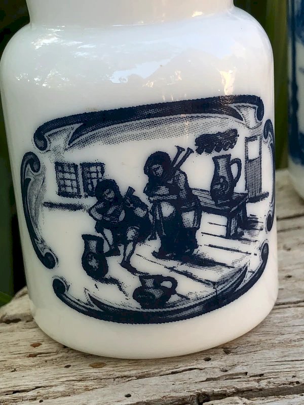 4 Pots d apothicaire vintage blancs et bleus en opaline en excellent état Hauteur totale 9,5 , 12,5 et 22,5 cm Diamètre de la base 4,5 , 6 et 10 cm