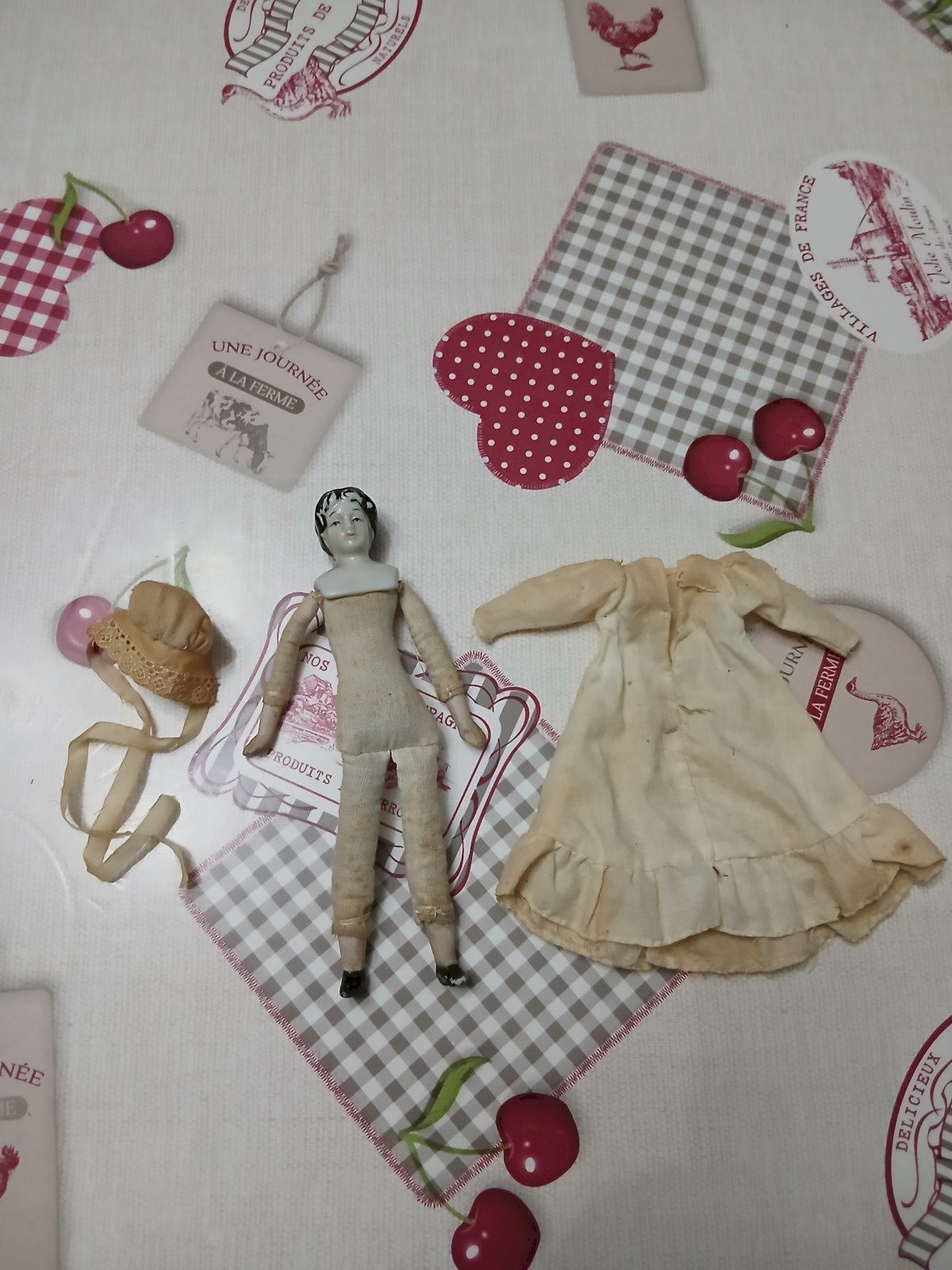 Lot de 5 anciennes petites poupées en céramique / porcelaine, vêtements dentelle