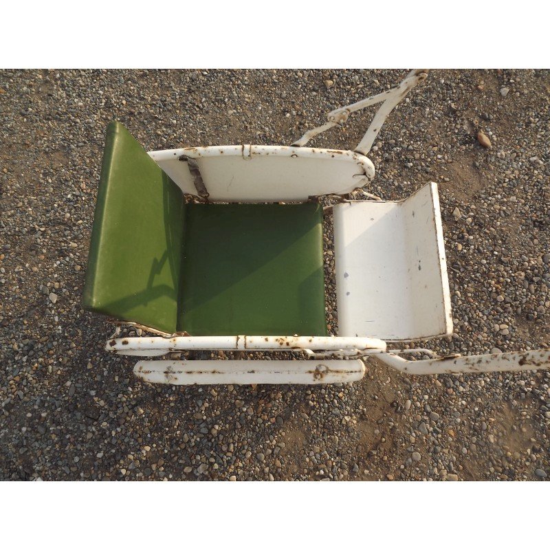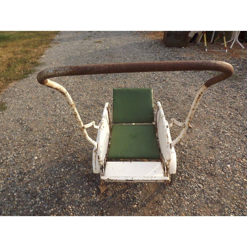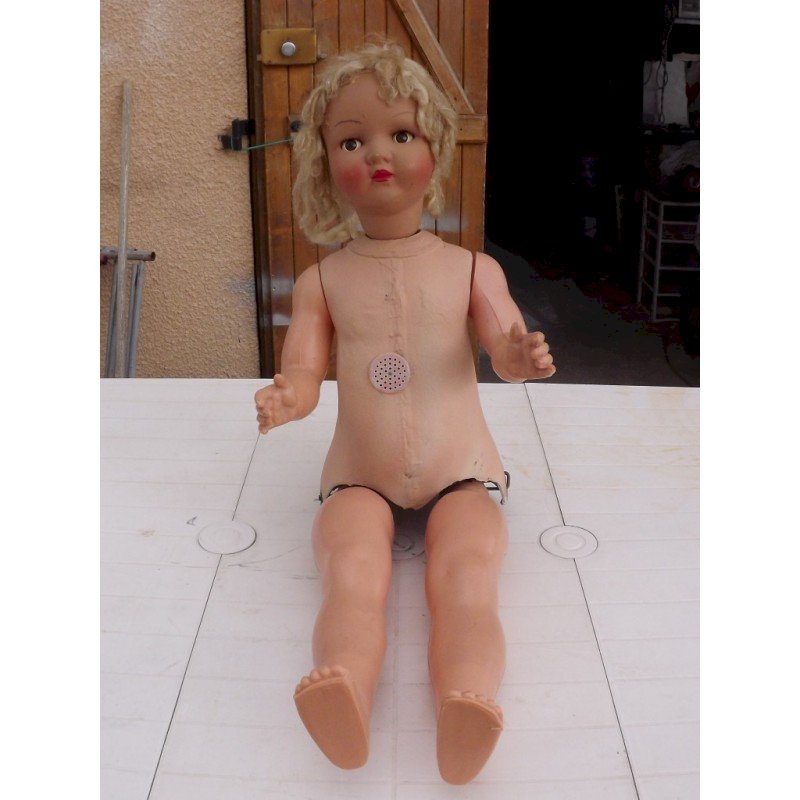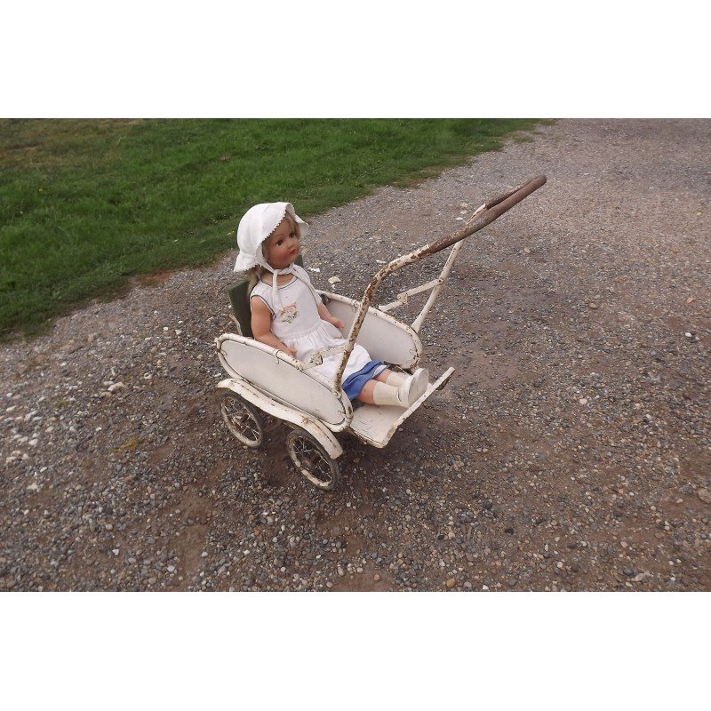 Poussette + Poupée des Années 50 , Poussette des Annèes 40/50 en tole , dossier skai , pneux d'origine , repliable , le dossier s'incline en position couchè ou assis , suspensions et freins , haut repliè : 44 cm , long et larg : 80 cm sur 48 cm , Poupèe ancienne , plastic , papier machè , mécanisme fer et bois , haut : 94 cm , long et larg : 25 cm sur 18 cm , chaussures plastic , chaussettes ,