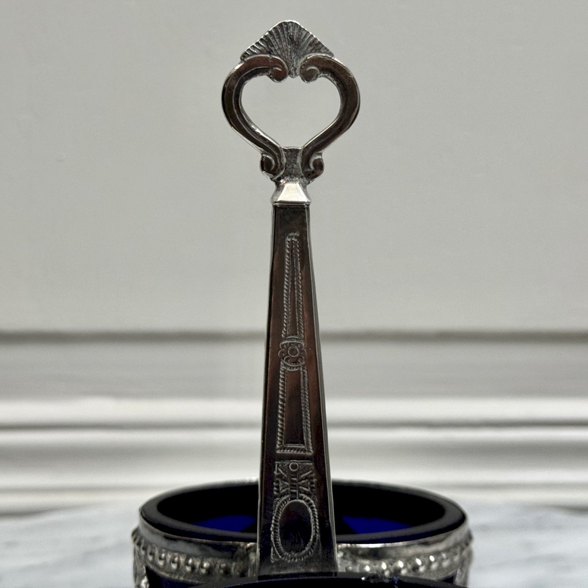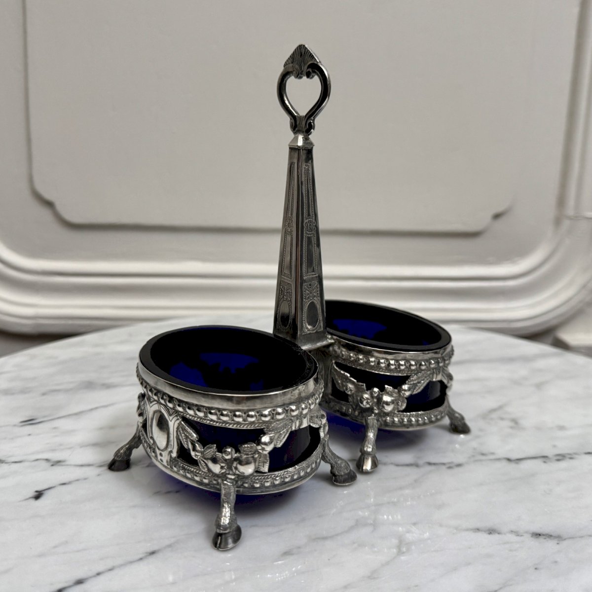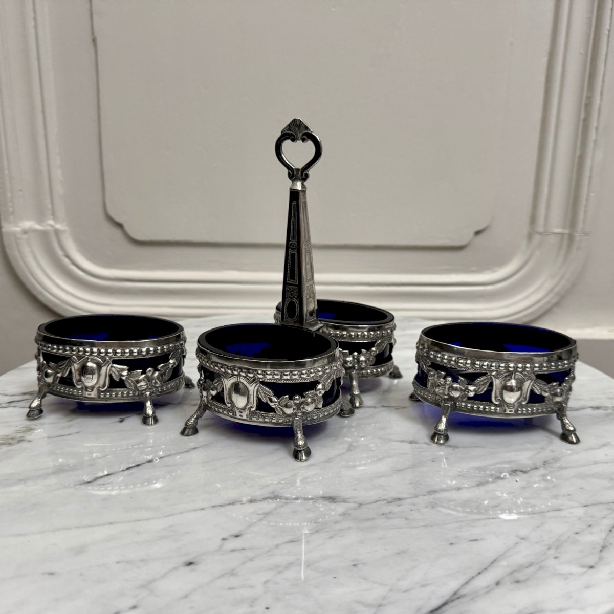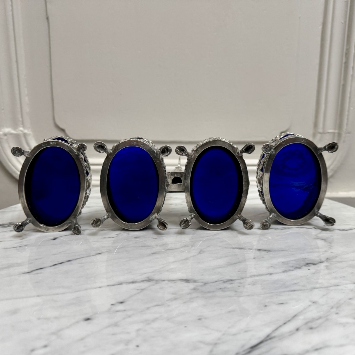 Quatre salières en argent massif Napoléon III XIXe pieds boucs M3918 Cet ensemble comporte une salière  en argent massif avec un manche central et  deux verrines bleues, elle est accompagnée de deux autres salières de modèles identiques.  Le tout est richement ornementé, classique de la période Napoléon III. Elle porte des poinçons et un monogramme. Pour l'état, notons des traces d'usure dues à l'usage, un métal fendu sur une des verrines (visible sur une photo), des petits éclats de verre dont un morceau manquant. Nos photos vous permettent d'apprécier la qualité de l'objet. Pour l'état, merci de bien détailler les photos. N'hésitez pas à zoomer . Les photos font partie intégrante de la description. Dimensions : - Salière double Hauteur : 15,7 cm Largeur : 14,3 cm Profondeur : 8,3 cm - Salière seule Hauteur : 4,5 cm Largeur : 8,3 cm Profondeur : 5,7 cm Poids : 272 g A :  J46XLMRKHE P :  1670345   Je reste à votre disposition pour toute question. Type:Art de la table, Cuisine Origine:France Pays d'origine:France Sous-type:Salières Hauteur:15,7 cm Matière:Argent massif Style:Napoléon III Longueur:cm Largeur:14,3 cm
