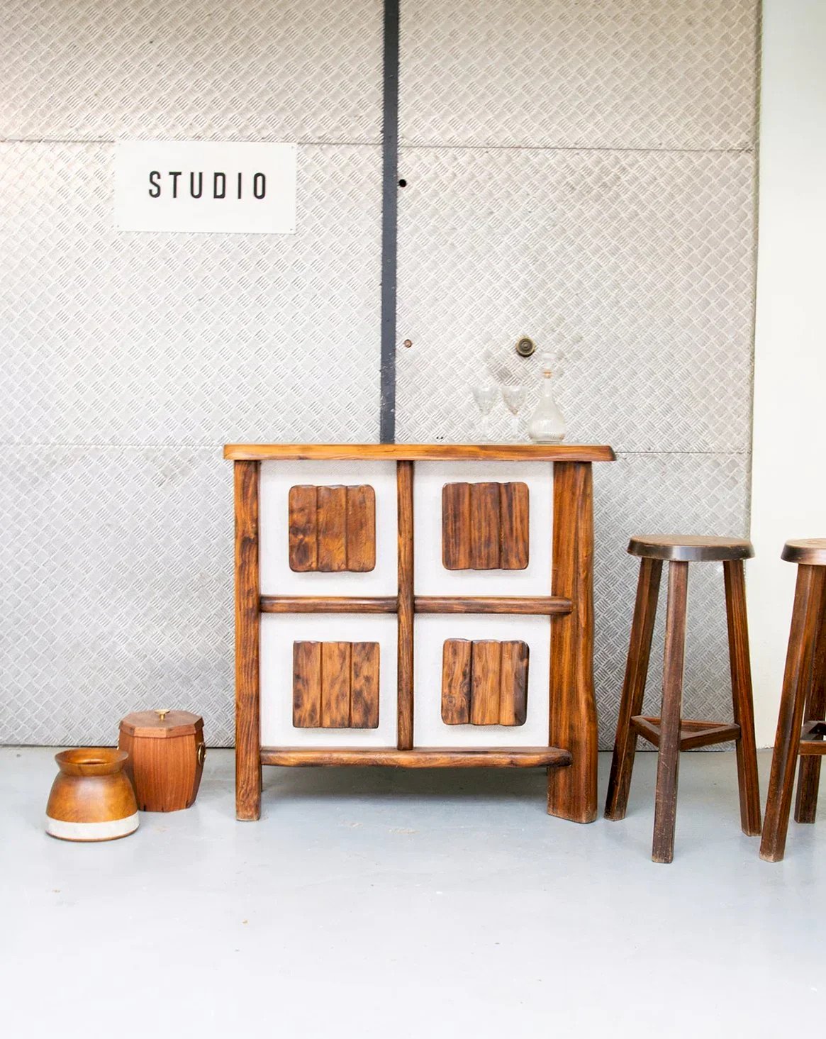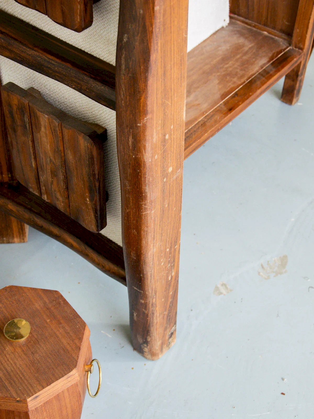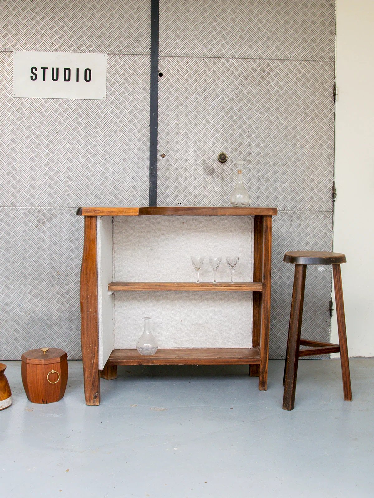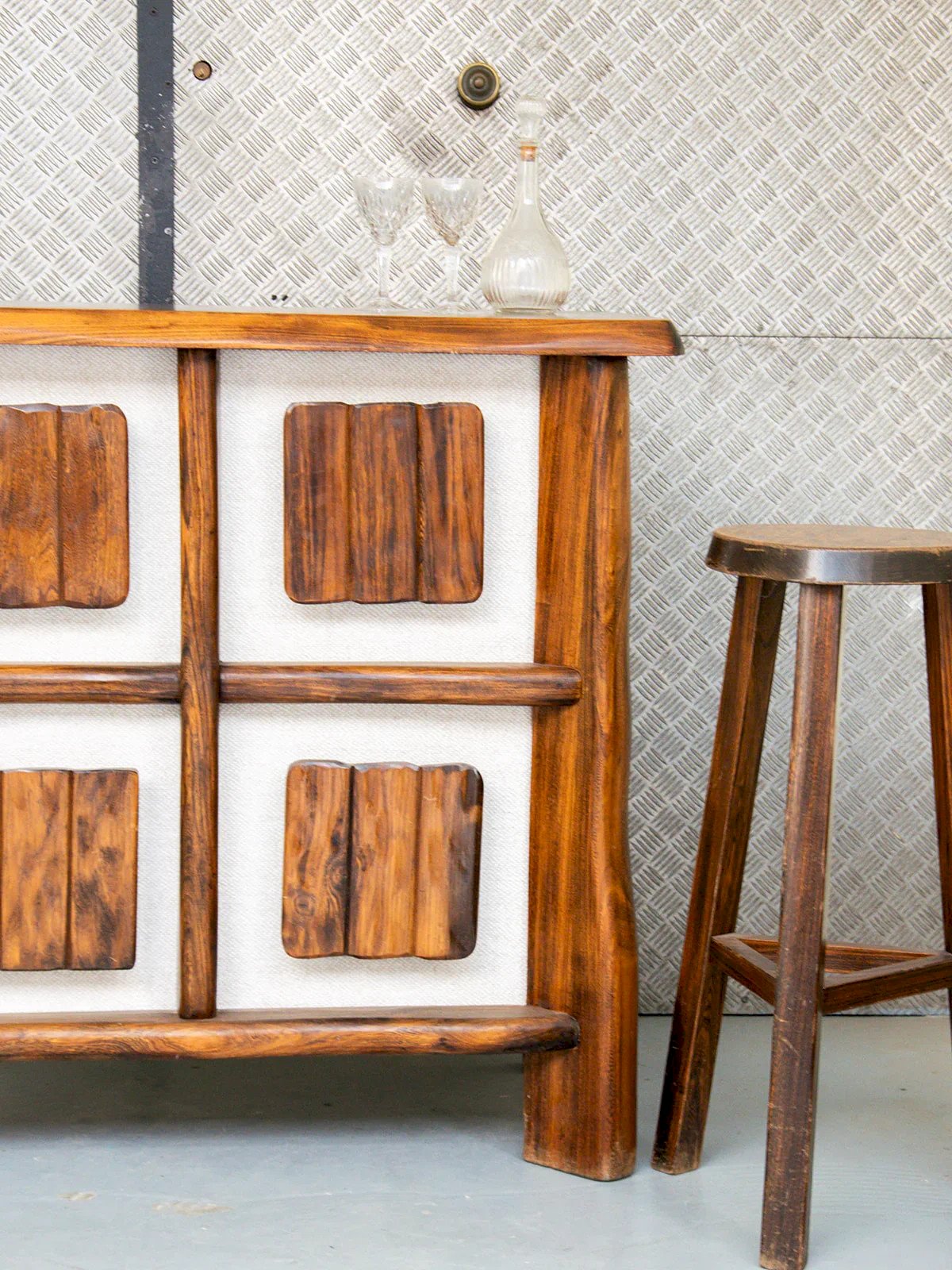 Découvrez ce bar en orme et tissu au style brutaliste affirmé, inspiré du travail d'Olavi Hanninen. Son design sculptural et ses lignes fortes en font une pièce rare et expressive. À l’arrière, deux étagères offrent un espace pratique pour le rangement. Le bois présente quelques traces du temps qui participent à son authenticité. Un meuble de caractère à l’esthétique marquée. Longueur : 106 cm Profondeur : 59 cm Hauteur : 104 cm Hauteur étagères : 38 à 40,5 cm État:Occasion: Objet ayant été utilisé. Objet présentant quelques marques d'usure superficielle, ...Occasion: Objet ayant été utilisé. Objet présentant quelques marques d'usure superficielle, entièrement opérationnel et fonctionnant correctement. Il peut s'agir d'un modèle de démonstration ou d'un objet retourné en magasin après une courte période d'utilisation. les éventuelles imperfections. Marque:Debongout Type:Produit chiné Matériau:Bois, Tissu Style:Contemporain Personnalisé:Meubles bar