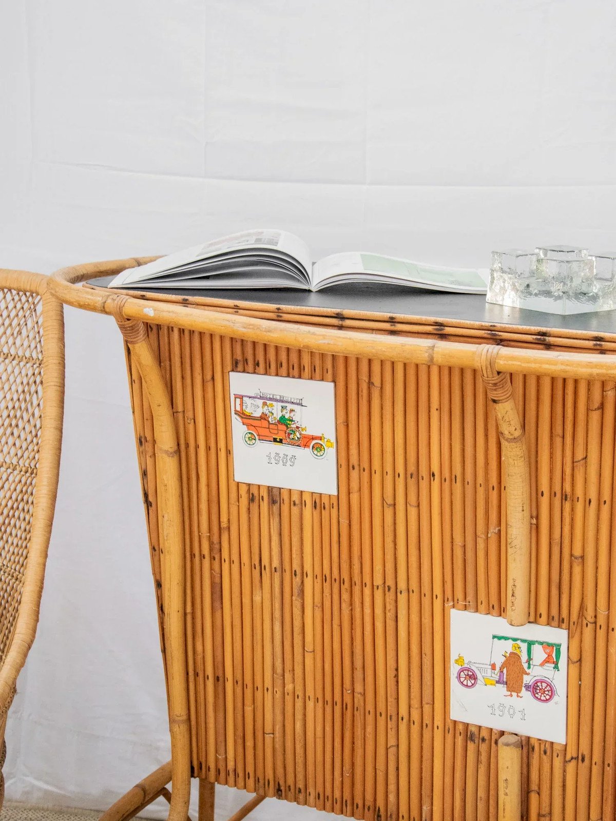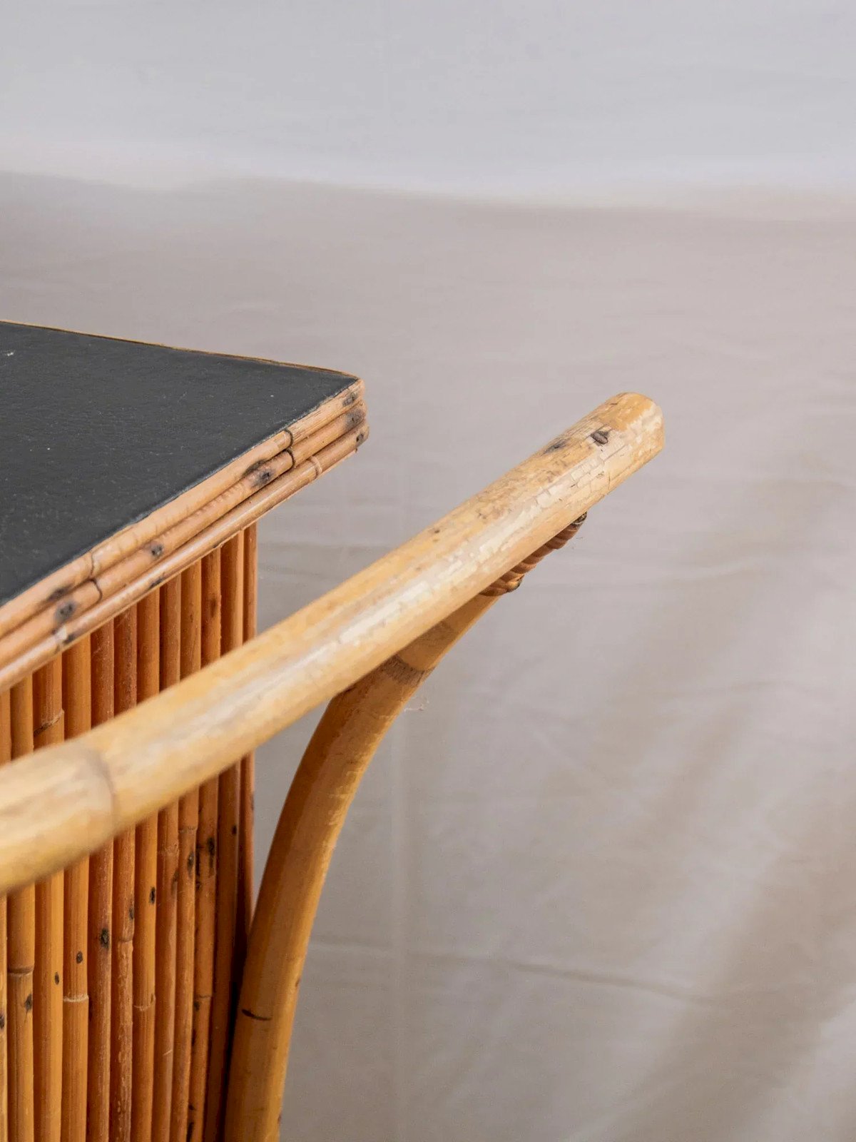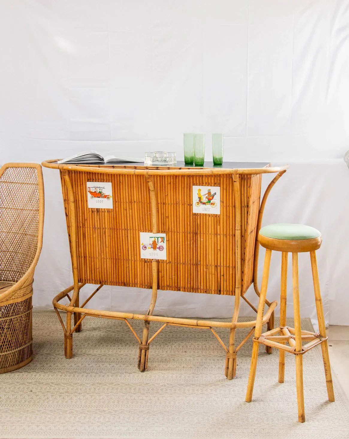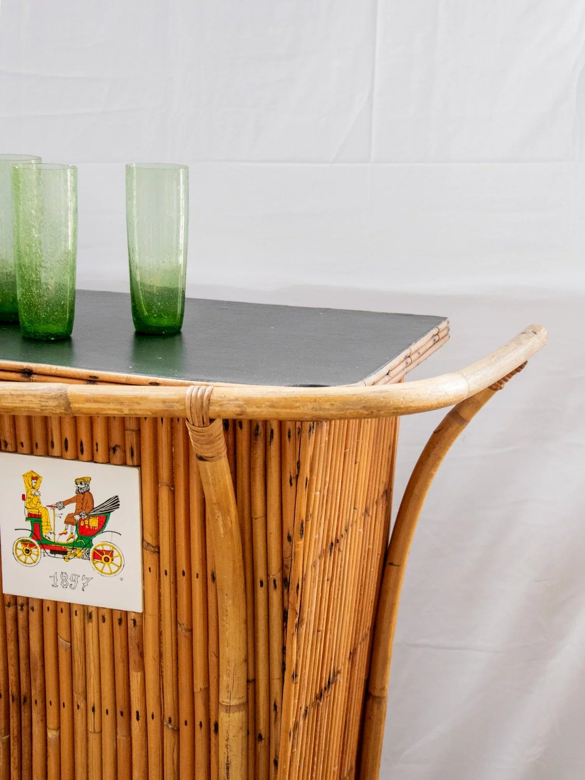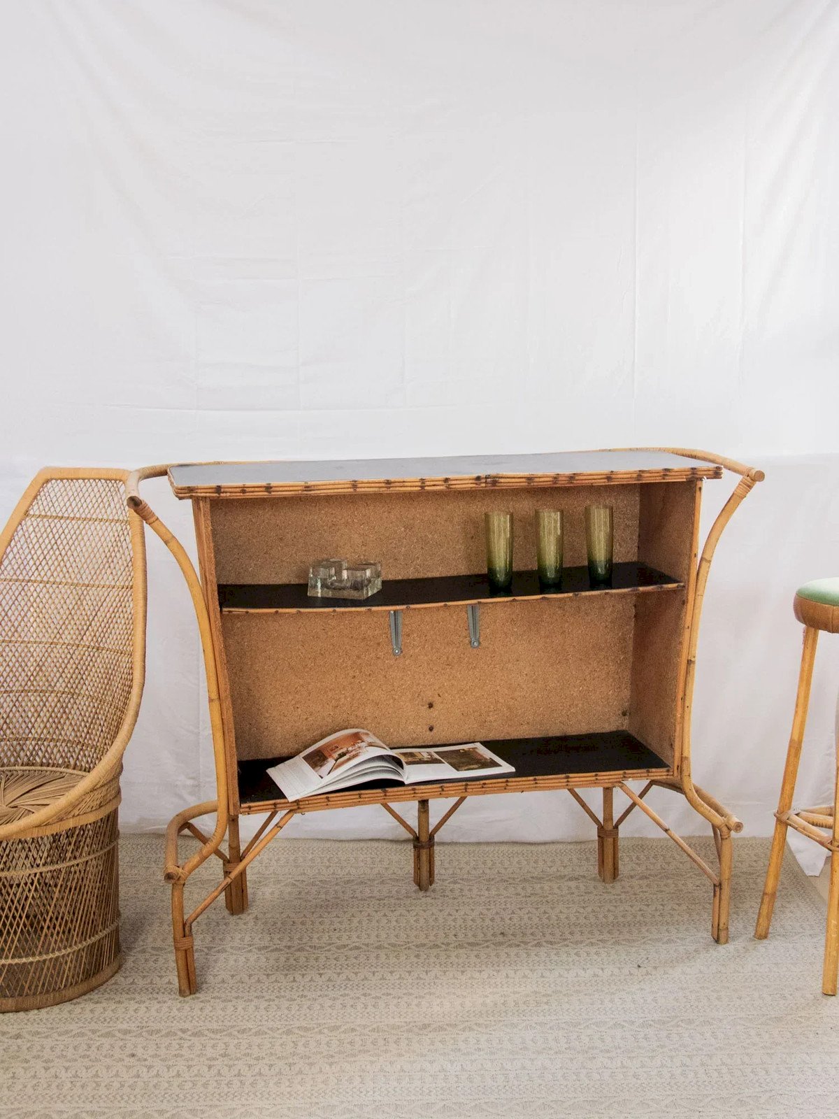 Découvrez notre élégant bar en rotin, alliant modernité et charme intemporel. Avec ses pieds fins et son plateau noir, il s'intègre parfaitement dans tout type d'intérieur. Ce meuble pratique offre deux espaces de rangement à l'intérieur, dotés de grandes niches pour accueillir vos bouteilles et accessoires. La touche finale est apportée par ses trois carreaux de faïence blancs à l'avant, ornés de délicats dessins peints, ajoutant une note artistique à votre espace. Un choix idéal pour les amateurs de décoration raffinée ! Longueur : 130 cm Largeur : 45 cm Hauteur : 112 cm Largeur du plateau : 40 cm Hauteur de la niche haute : 24 cm Hauteur de la niche basse : 40 cm État:Occasion: Objet ayant été utilisé. Objet présentant quelques marques d'usure superficielle, ...Occasion: Objet ayant été utilisé. Objet présentant quelques marques d'usure superficielle, entièrement opérationnel et fonctionnant correctement. Il peut s'agir d'un modèle de démonstration ou d'un objet retourné en magasin après une courte période d'utilisation. les éventuelles imperfections. Marque:Debongout Type:Produit chiné Matériau:Rotin Style:Contemporain Personnalisé:Meubles bar