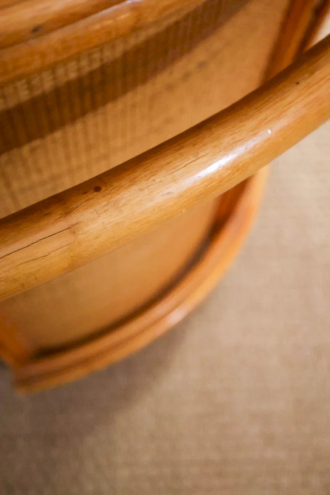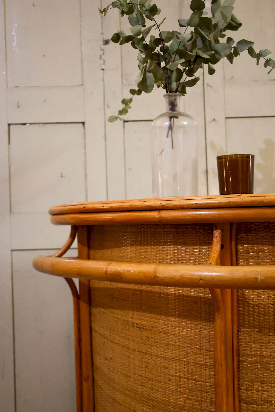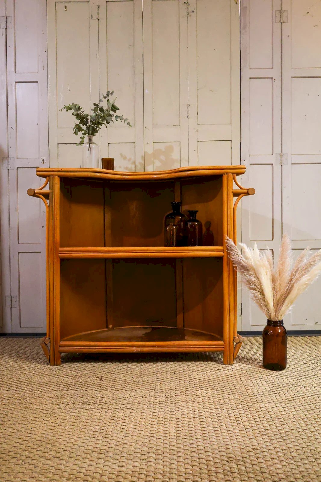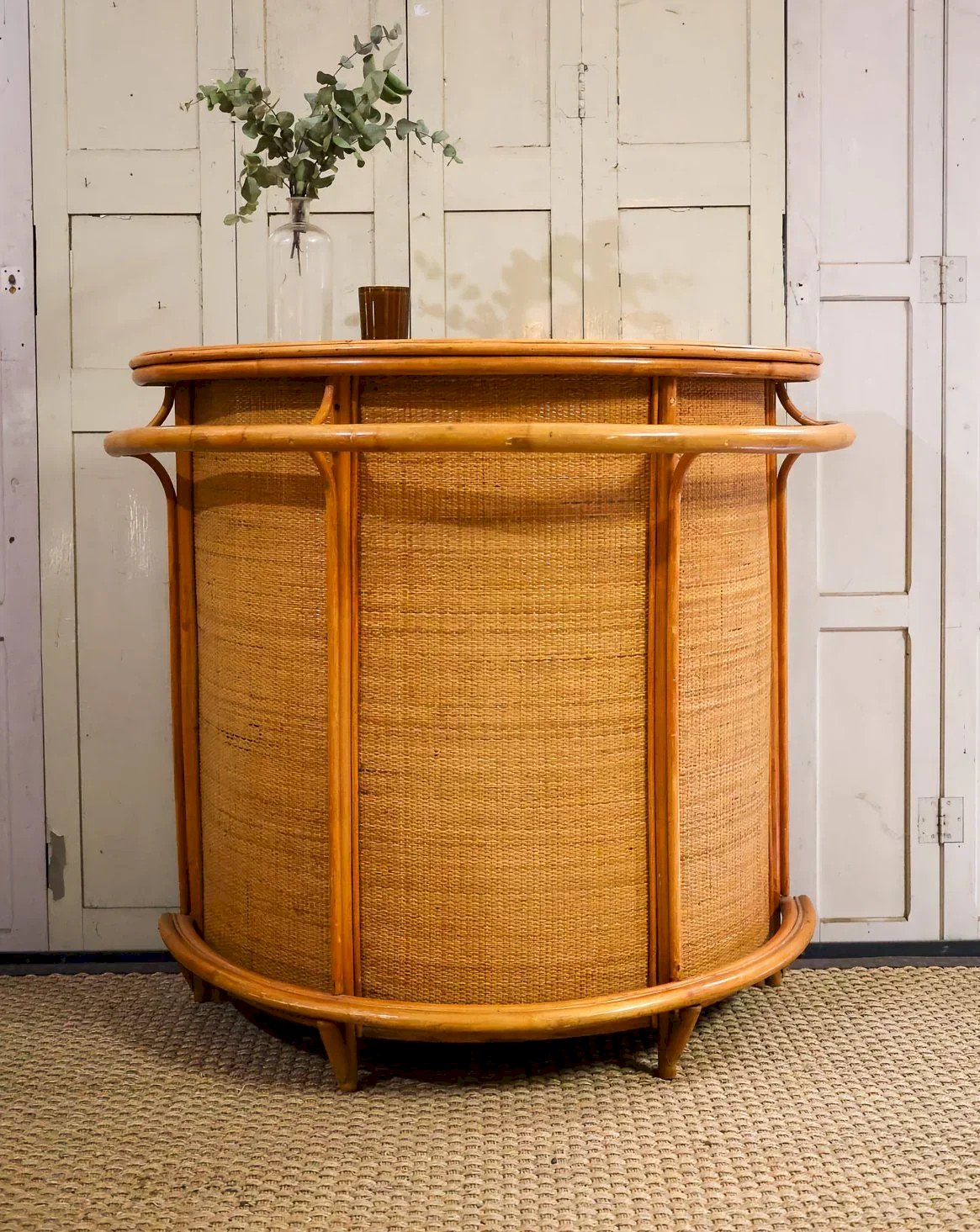 Offrez un esprit bohème-chic à votre intérieur avec ce bar en rotin, alliant légèreté et chaleur naturelle. Sa structure arrondie et sa large surface de service accueillent bouteilles et verres, tandis qu'une étagère intégrée optimise le rangement des indispensables pour recevoir. Le tressage artisanal et la teinte douce introduisent une texture authentique qui adoucit l'ambiance, idéal pour un coin apéritif convivial dans le salon, la cuisine ou la véranda, créant instantanément une atmosphère détendue et élégante. Usures présentes. Longueur : 125 cm Largeur : 66 cm Hauteur : 104 cm Hauteur sous plateau : 62 cm État:Occasion: Objet ayant été utilisé. Objet présentant quelques marques d'usure superficielle, ...Occasion: Objet ayant été utilisé. Objet présentant quelques marques d'usure superficielle, entièrement opérationnel et fonctionnant correctement. Il peut s'agir d'un modèle de démonstration ou d'un objet retourné en magasin après une courte période d'utilisation. les éventuelles imperfections. Marque:Debongout Type:Produit chiné Matériau:Rotin Style:Contemporain Personnalisé:Meubles bar