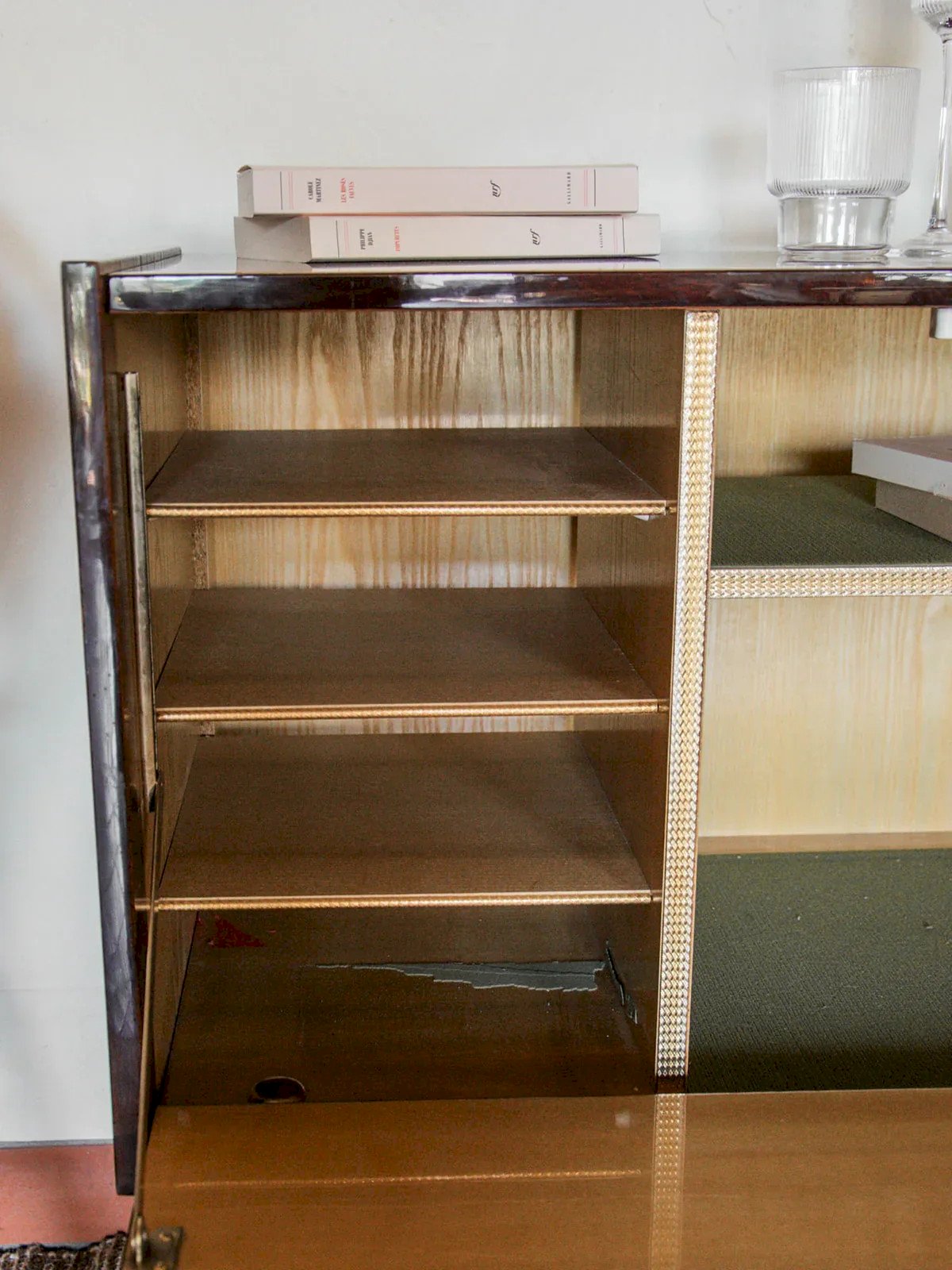 Un mini bar sur roulettes en bois foncé, plein de charme et de caractère. Ses marqueteries vernies et ses détails dorés en laiton lui donnent une allure chic et rétro. À l’intérieur, plusieurs niches de tailles variées permettent de ranger bouteilles et verres avec style. On aime son dos légèrement renfoncé et percé, qui le rend aussi pratique qu’original. Quelques traces du temps viennent parfaire son authenticité. Une pièce unique à adopter pour vos plus belles soirées. Largeur : 84,5 cm Hauteur : 80 cm Profondeur : 45 cm Hauteur de la niche : 9,5 / 12 / 25,5 cm État:Occasion: Objet ayant été utilisé. Objet présentant quelques marques d'usure superficielle, ...Occasion: Objet ayant été utilisé. Objet présentant quelques marques d'usure superficielle, entièrement opérationnel et fonctionnant correctement. Il peut s'agir d'un modèle de démonstration ou d'un objet retourné en magasin après une courte période d'utilisation. les éventuelles imperfections. Marque:Debongout Type:Produit chiné Matériau:Bois, Laiton Style:Contemporain Personnalisé:Meubles bar
