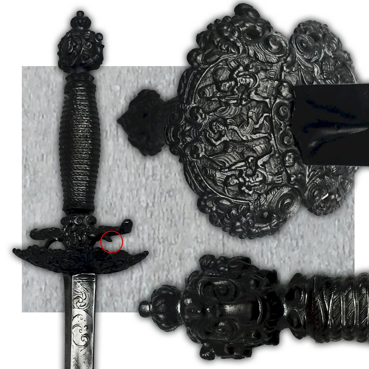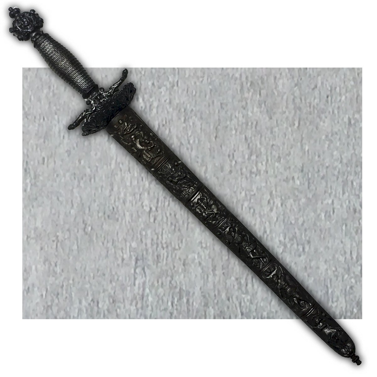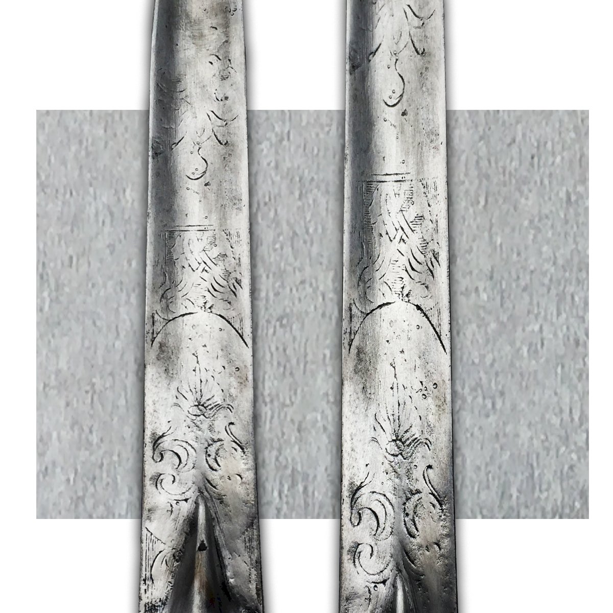 Rarissime et superbe Dague - Épée d'officier français type ancien régime, production probablement du XIX de Viollet-Le-Duc avec une lame Colichemarde. Poignée en acier sombre, gravée dans le style Rococo. La lame est superbement gravée en très bon état avec '' Dessins ''. Plateau en forme de coquille, ((petit manque sur un crochet visible photo N°8 !)). Le fourreau est en acier, également gravé avec des figures du XVIII, un côté plat qui comportait probablement un système de fixation autrefois, des traces encore visibles. Très belle pièce dans son jus, superbe ! Une superbe pièce, très agréable à tenir en mains et encore plus à observer dans sa vitrine de collection, 100% original et rare.