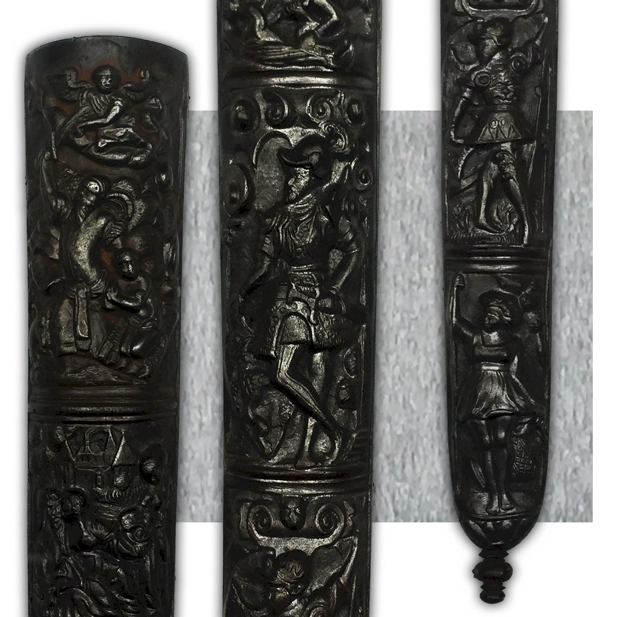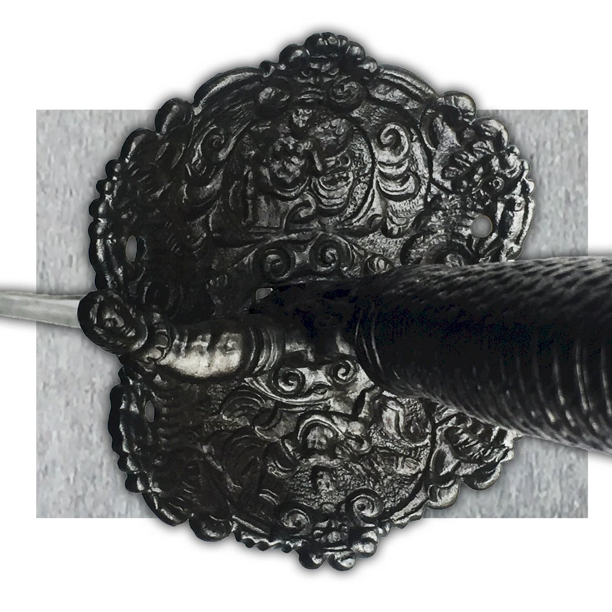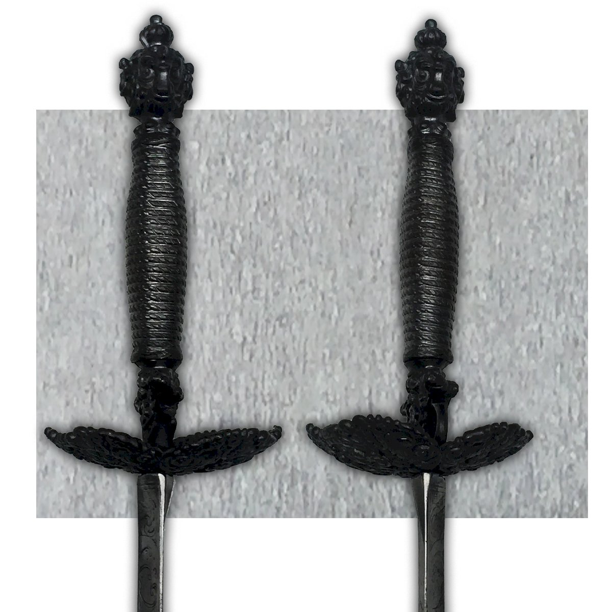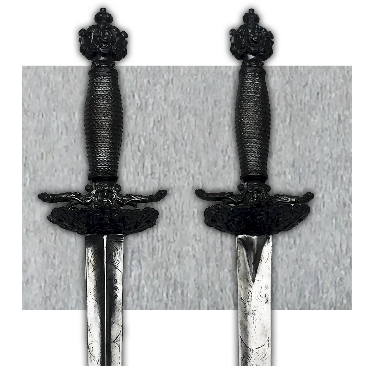 Rarissime et superbe Dague - Épée d'officier français type ancien régime, production probablement du XIX de Viollet-Le-Duc avec une lame Colichemarde. Poignée en acier sombre, gravée dans le style Rococo. La lame est superbement gravée en très bon état avec '' Dessins ''. Plateau en forme de coquille, ((petit manque sur un crochet visible photo N°8 !)). Le fourreau est en acier, également gravé avec des figures du XVIII, un côté plat qui comportait probablement un système de fixation autrefois, des traces encore visibles. Très belle pièce dans son jus, superbe ! Une superbe pièce, très agréable à tenir en mains et encore plus à observer dans sa vitrine de collection, 100% original et rare.