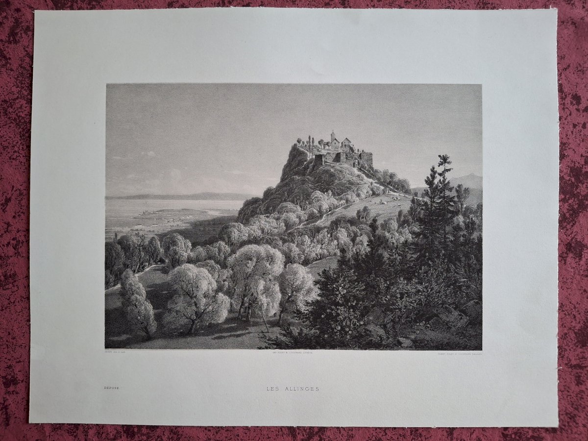Gravure vue de Allinges (sous son ancien nom Les Allinges) Haute Savoie.