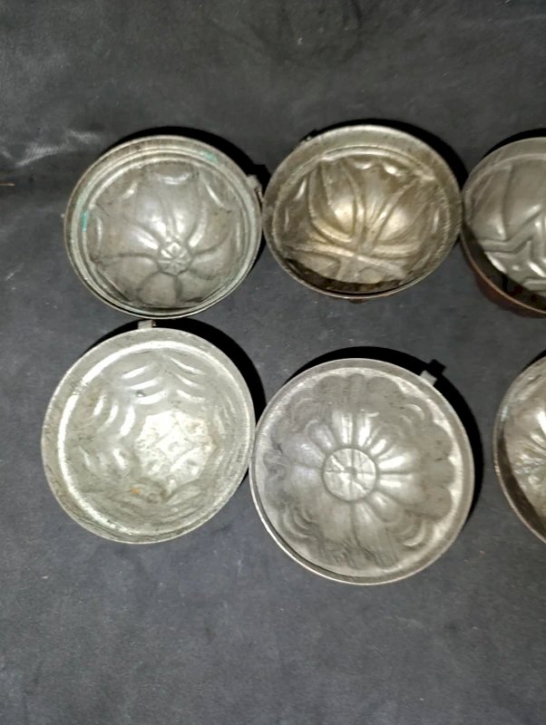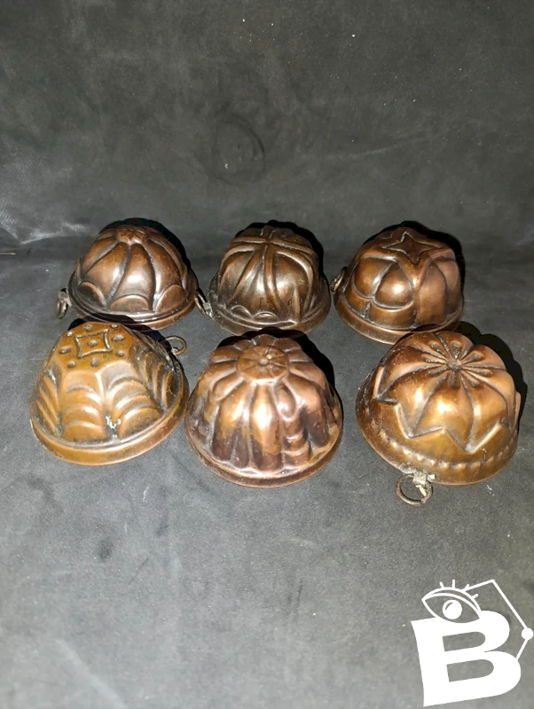 rare lot de 6 mini moules a gâteaux en cuivre ancien en bon etat patine du temps interieur et exterieur voir photos les 6 moules sont de forme differrentes taille moyenne Ø7.5 hauteur 4cm