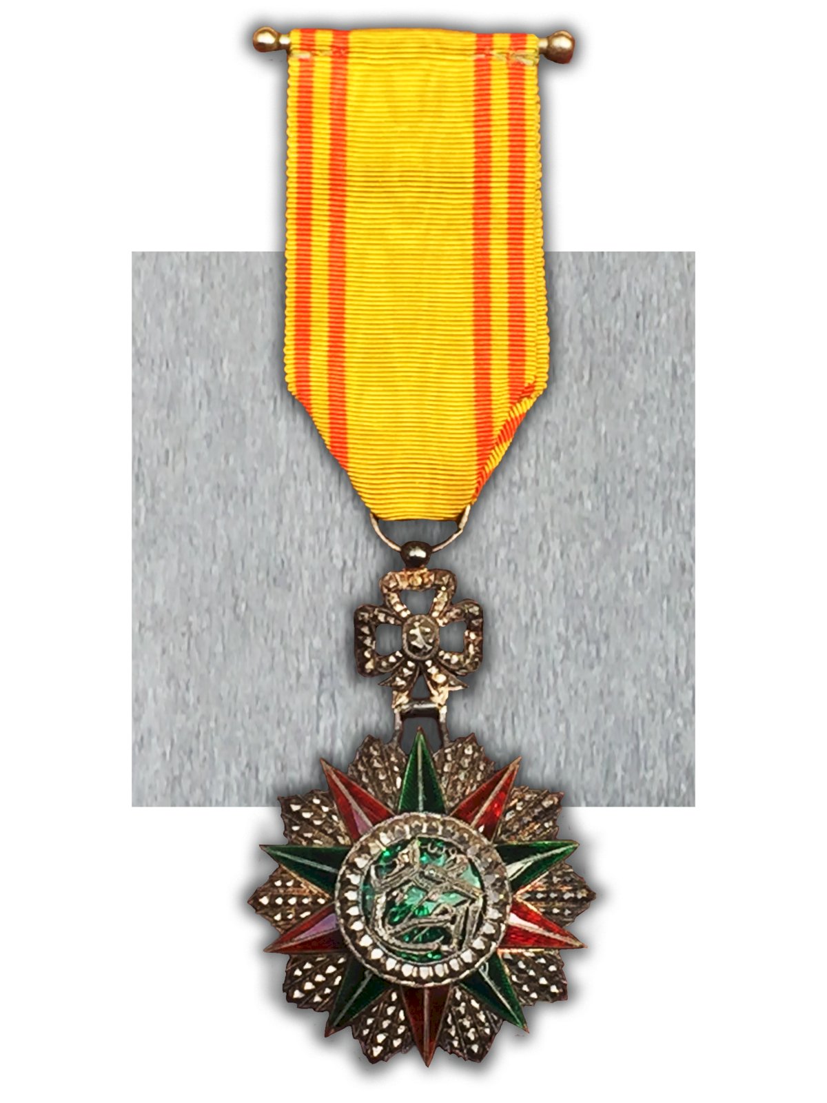 Très belle croix / médaille en argent pour officier de Nichan Iftikhar, début XX. Croix diamentée et émaillée rouge et vert au centre avec une inscription en arabe : '' MOHAMED EL HADI ''. Fabrication français probablement '' Boulanger '' (à vérifier), avec son ruban d'origine jaune bordé de lignes oranges, marqué au dos 1906-22.Très agréable à tenir en mains et encore plus à observer en vitrine. Très rare et 100% original garantie.