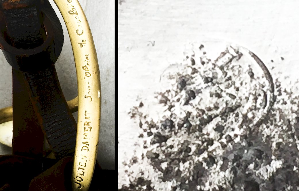 Superbe sabre de la cavalerie française modèle 1822, avec nom gravé sur la poignée '' JULIEN DEMERAT SOUS-OFFICIER DE CAVALERIE ''. Belle poignée avec une garde à 3 branches, filigranne présent dans son jus, pas de jeu. Lame très belle, courbée à un tranchant. Fourreau en fer dans son jus à un anneau, avec sa dragonne en cuir et le fouet en cuir de cavalerie, le tout très beau ! Très belle et massive pièce dans son jus en bel état ! Très agréable à tenir en mains et encore plus à observer en vitrine, rare aussi complet et surtout NOMINATIF ! ! ! Rare et 100% original !