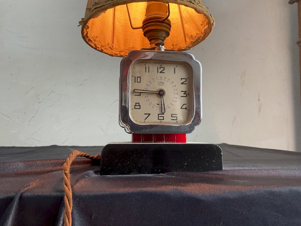 Rare réveil ancien lampe qui fonctionne aux 110 v réveil COTNA électrique Socle en onyx et Bakélite  Lampes fonctionne en 220 Mais réveil pas testé État:Occasion: Objet ayant été utilisé. Consulter la description du vendeur pour avoir plus de détails ...Occasion: Objet ayant été utilisé. les éventuelles imperfections. Couleur:chrome Type:Réveil Période:Design du XXème Mécanisme:electric Sous-type:A aiguilles Matière:Métal Style:1920-1940 Caractéristiques:Sonnerie, Carillon