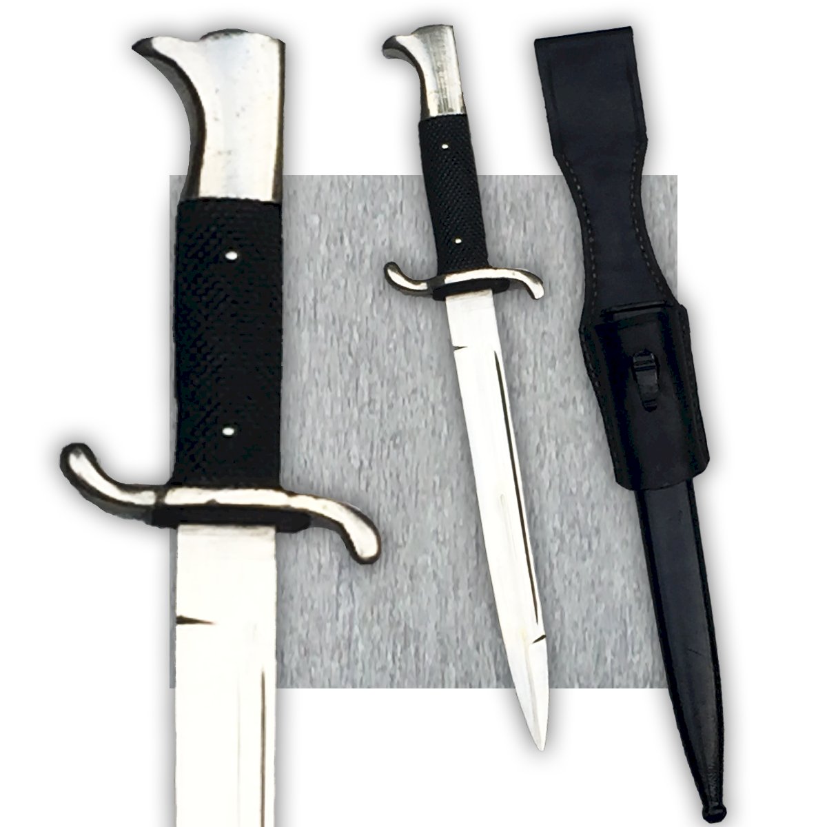 Superbe, dague poignard allemand, datant de la deuxième guerre mondiale. La poignée est quadrillée noire et comporte deux rivets de chaque côté, en forme de tête d'aigle (symbole de l'Allemagne). La lame est en très bon état, encore brillante, dans son jus. La fourreau est peint de noir, avec sa peinture d'origine et un bouton de fixation (immobile) avec son baudrier en cuir. Superbe dague très agréable à tenir en mains et encore plus à observer en vitrine ! Super er rare pièce, très propre et totalement originale !