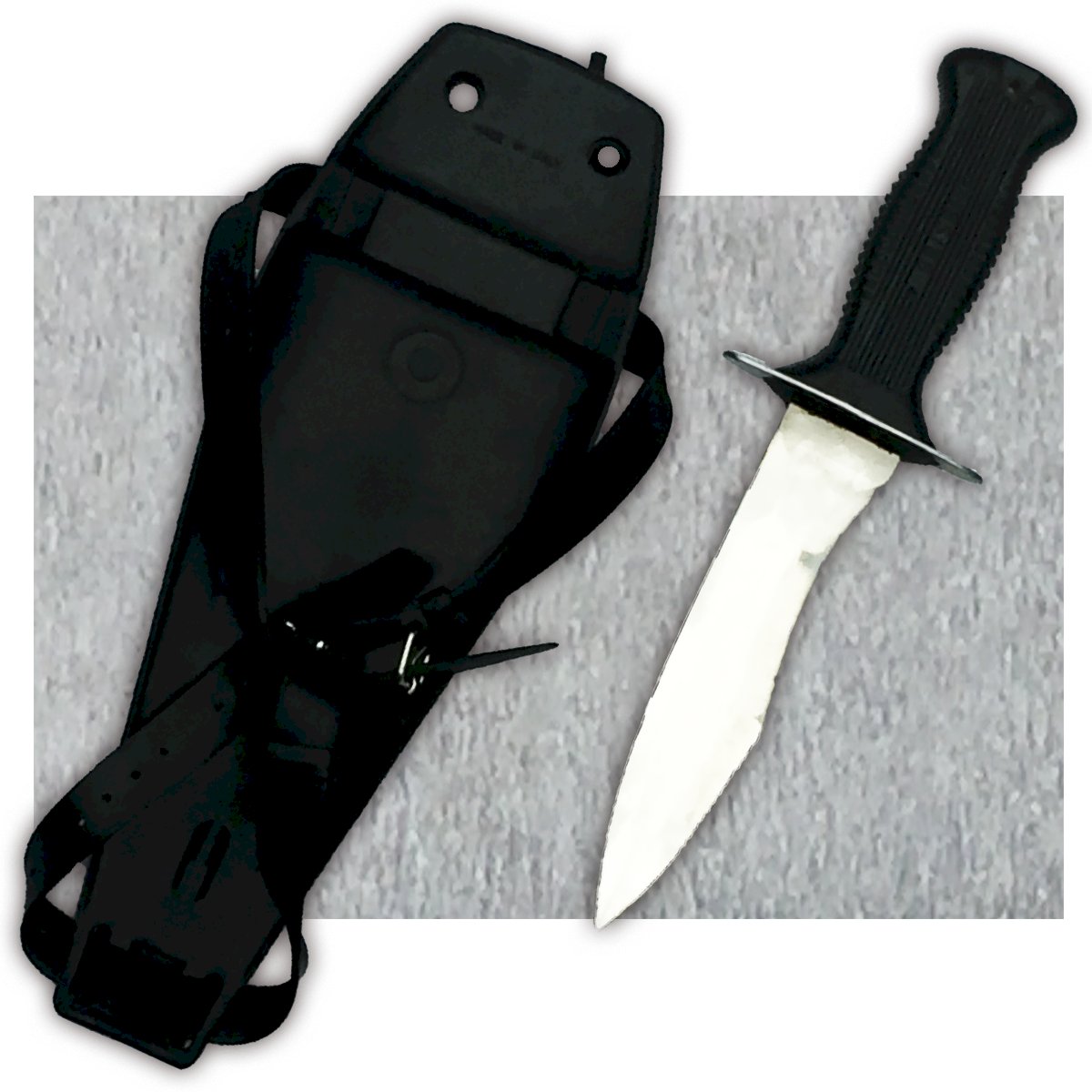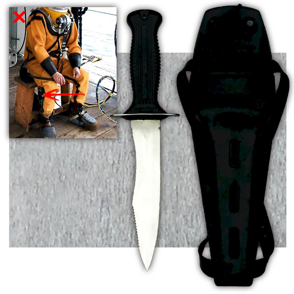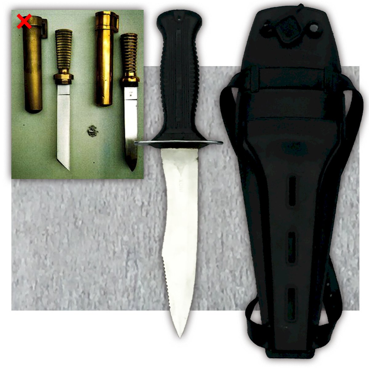 Tres rare couteau version militaire de plongeur scaphandrier conçu pour le déminage (acier spécial). Il s'agit de la version réglementaire, utilisée par les plongeurs démineurs (minentaucher et kampfschwimmer) avec le scaphandre draeger dm 220. D'après son ancien propriétaire, le couteau serait inspiré des modèles allemands dans les années 50-60 (à vérifier).