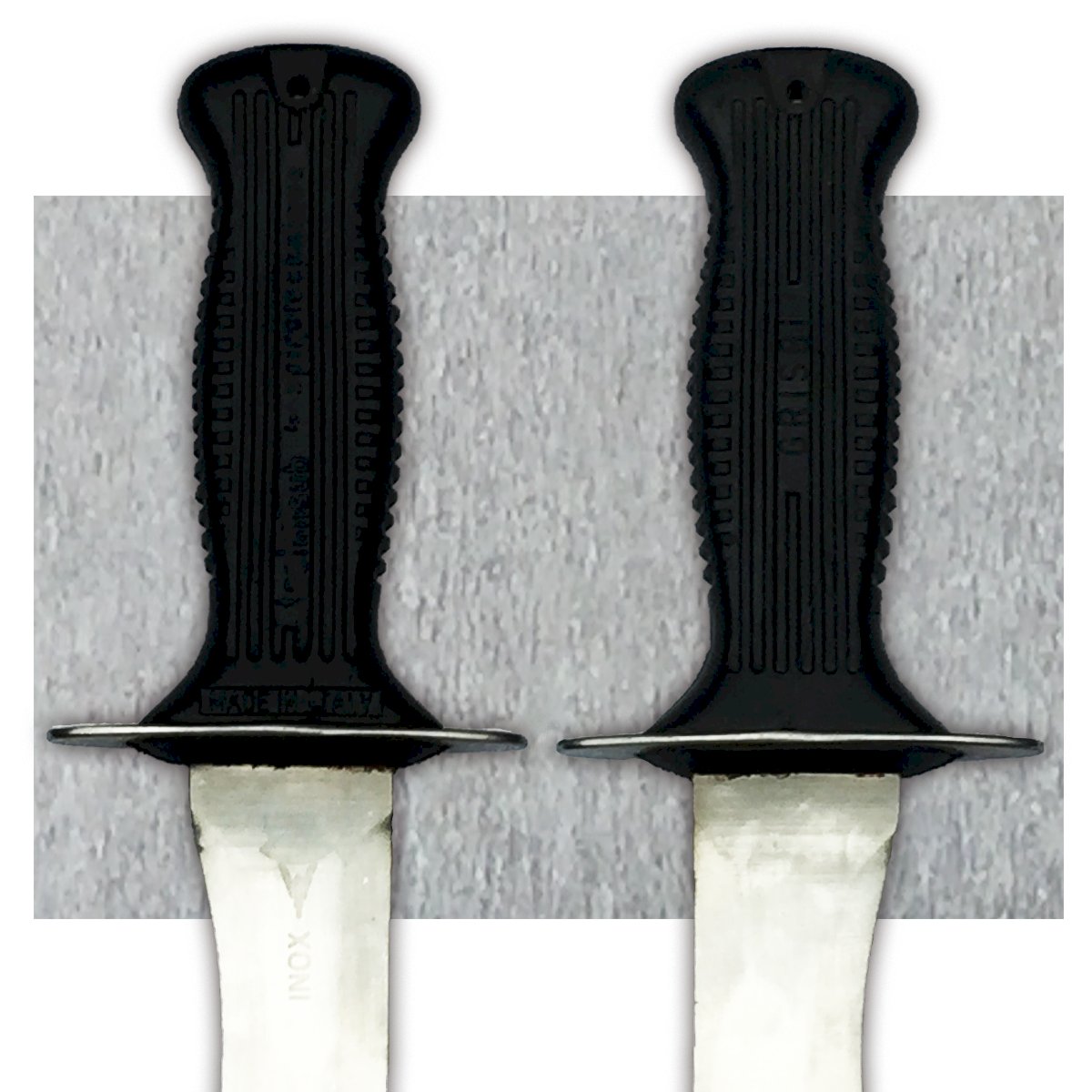 Superbe couteau de type plongeur ou démineur. La poignée est en plastique noir, marqué '' Grisbi ''. La lame état en très bon état de conservation, brillante, marquée '' Inox Grisbi '' avec le fourreau en plastique, très robuste. Pas de jeu, très beau couteau, très solide, pas de manque et pas de défauts, très rare sur ce site. Petit manque au cordon en plastique sans gravité. Petit prix à saisir !
