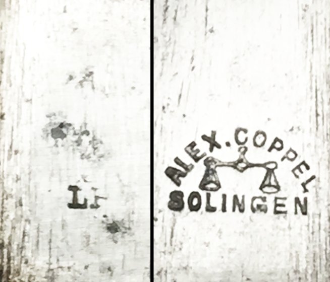 Rarissime et superbe dague / baïonnette chilienne. Poignée en bois et métal avec système de fixation. Très jolie lame dans son jus, estampillée '' ALEX COPPEL SOLINGEN '' + divers marquages : '' L '' + '' B1435 ''. Fourreau en fer sombre et laiton. Fixation pour baudrier devant le fourreau. Très belle et rare pièce dans son jus, pour tout collectionneur avertis !