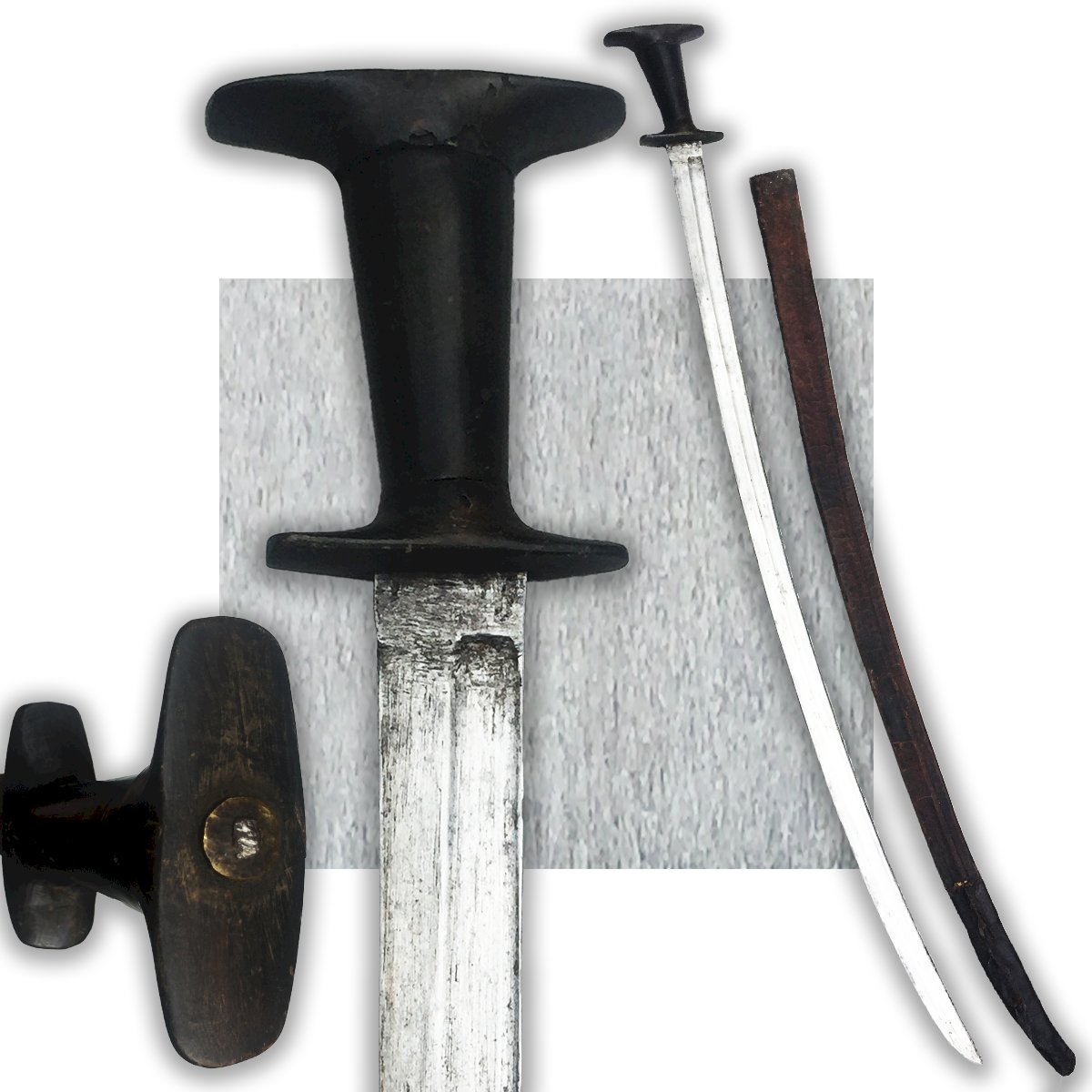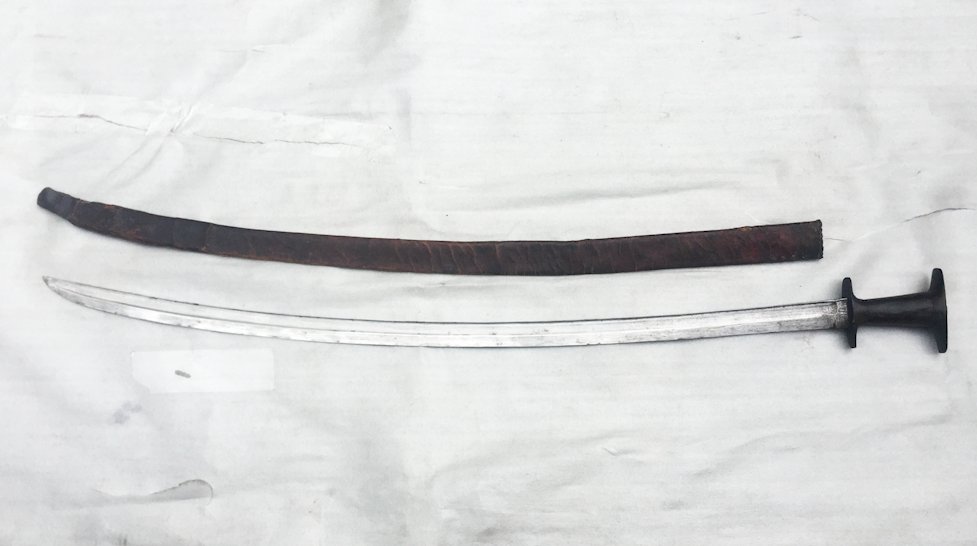 Voici un magnifique sabre Ethiopien, période première moitié du XX. Probablement utilisé durant la guerre italo-éthiopienne. La poignée est en bois laquée assemblée en trois morceaux avec des ébrechures dûes à l'utilisation. Lame à une gouttière centrale, assez propre et massive dans son jus à nettoyer ! Fourreau récouvert de reliefs militaires. Belle pièce, très peu courante, dans son jus !